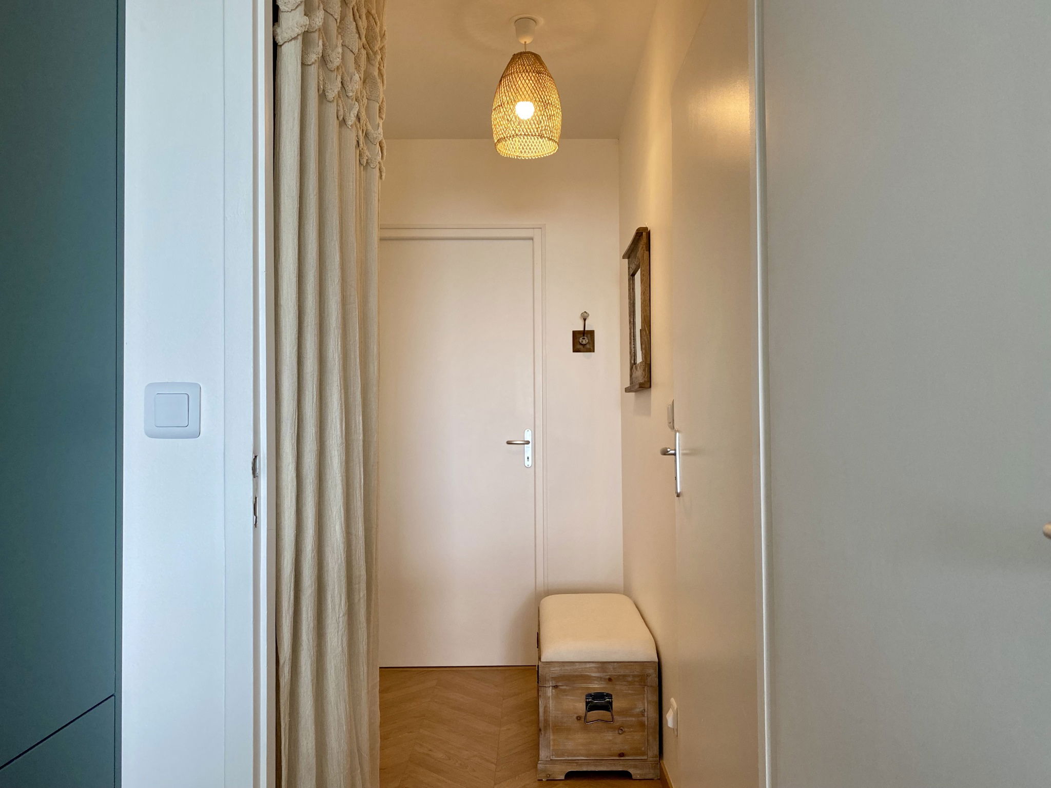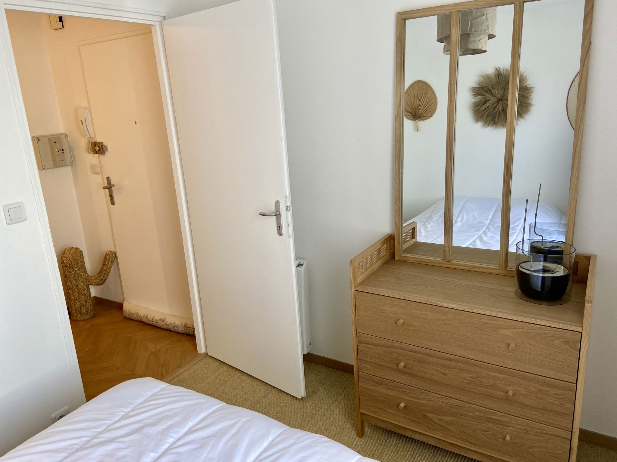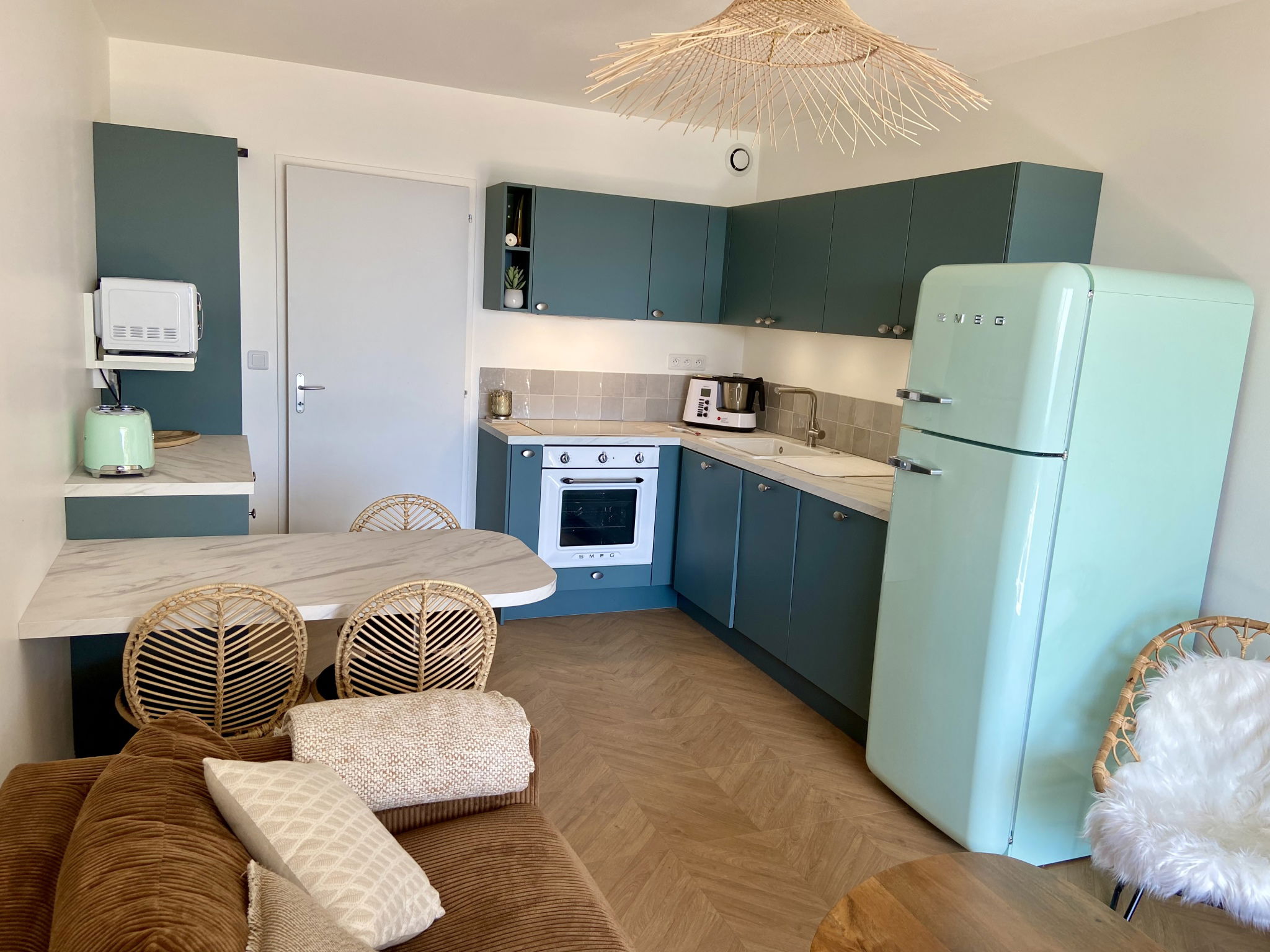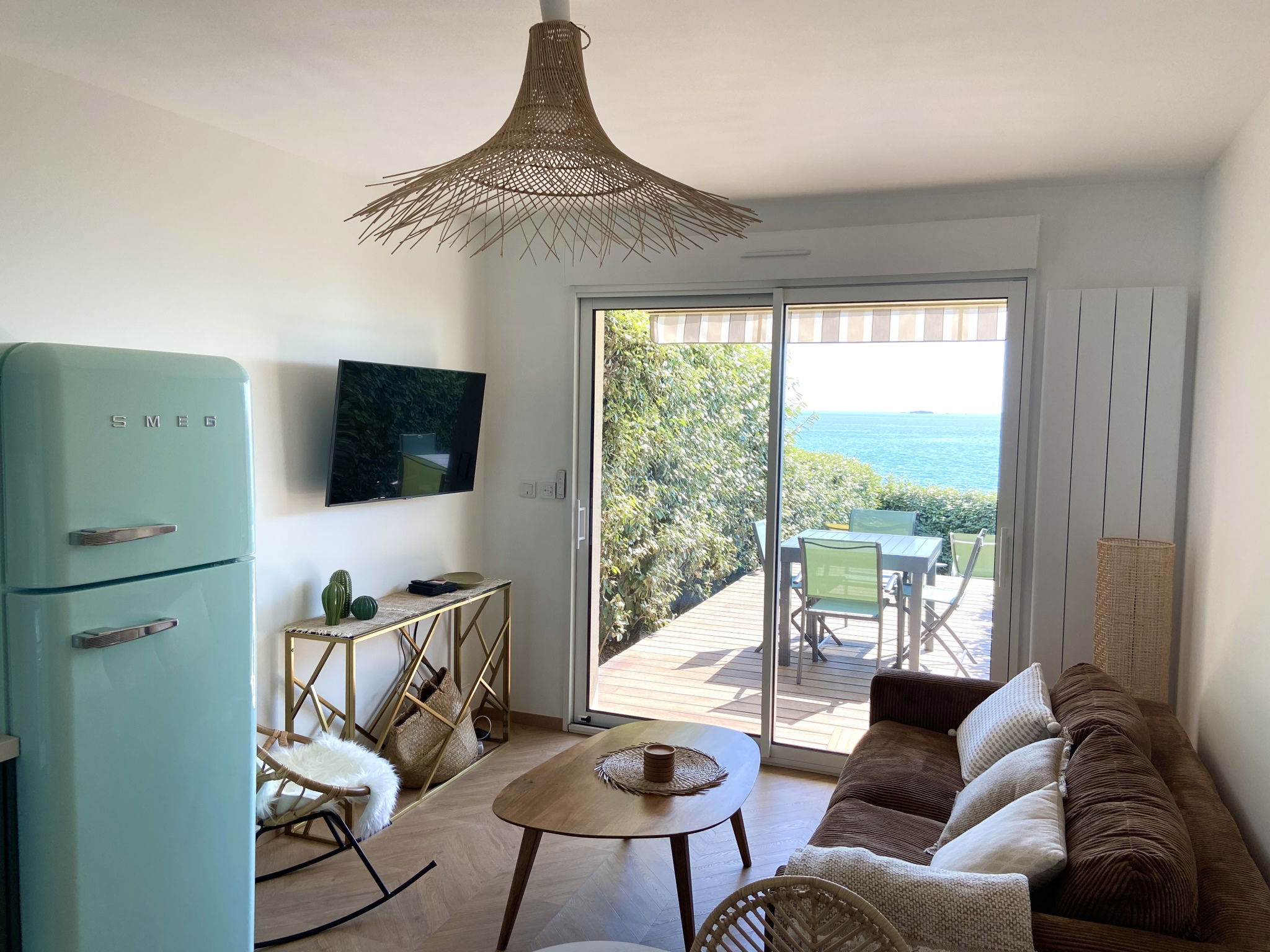 Come and enjoy the seaside in this superb apartment completely redone with quality materials and equipment - Entrance with cupboard - Living room with fitted and equipped kitchen (fridge / freezer - Microwave - Oven - Induction hob - Hood - Toaster - Kettle - Dishwasher - Washer-dryer) lounge area with TV and sea view - Terrace with furniture facing South/West - Bedroom with 140x190 bed + chest of drawers - Bathroom with walk-in shower - WC - Outdoor parking - Bike room - WIFI