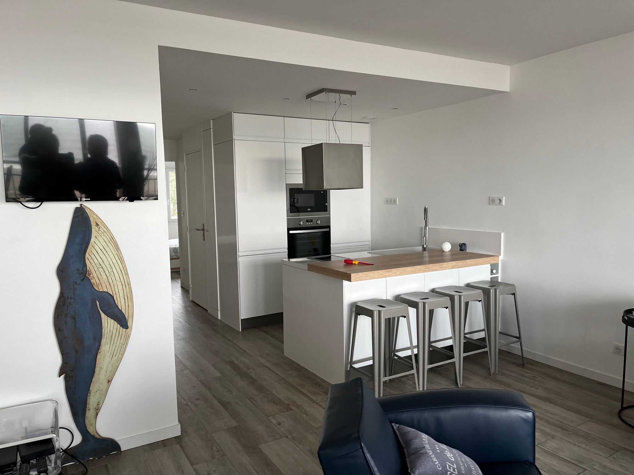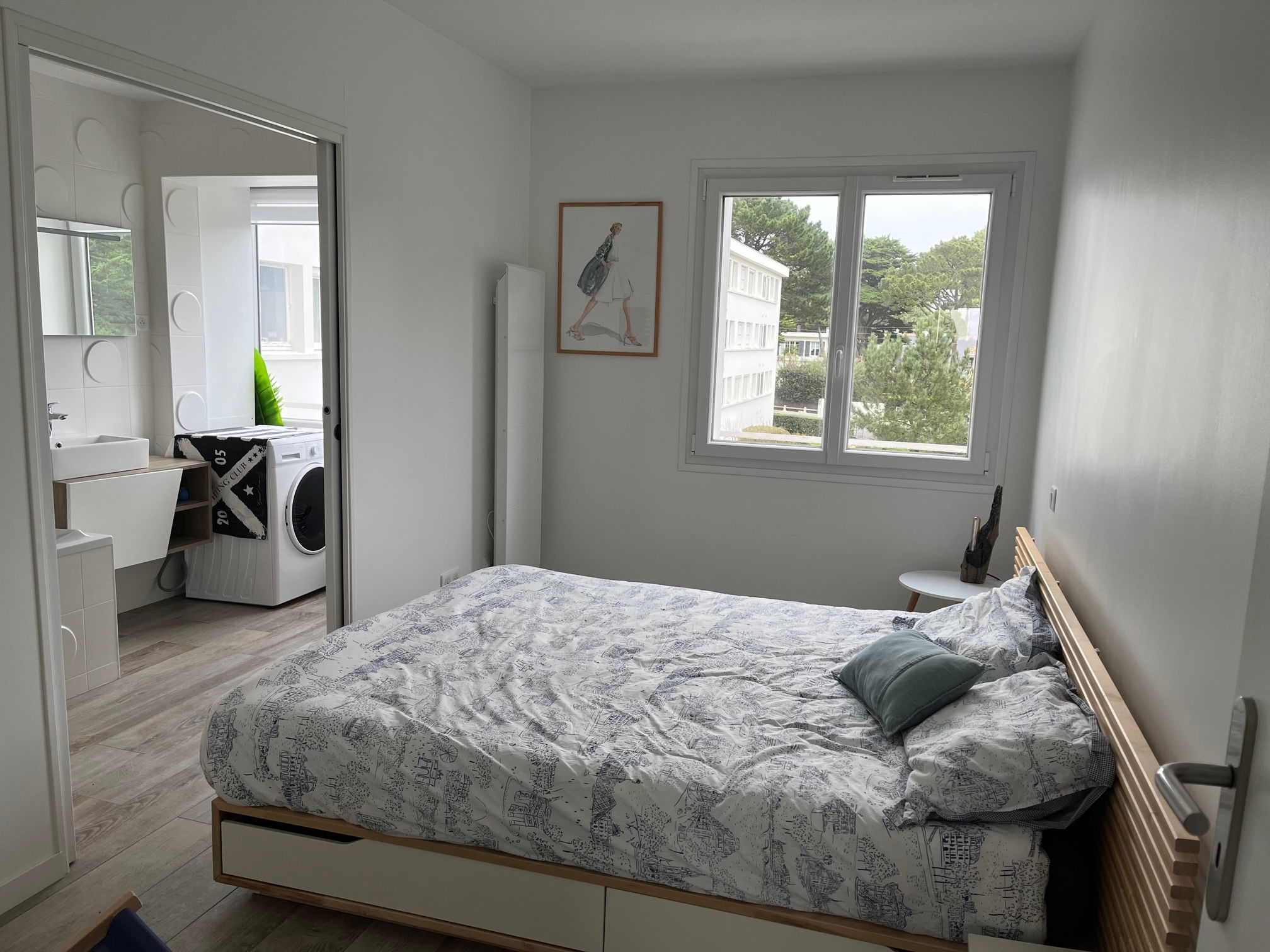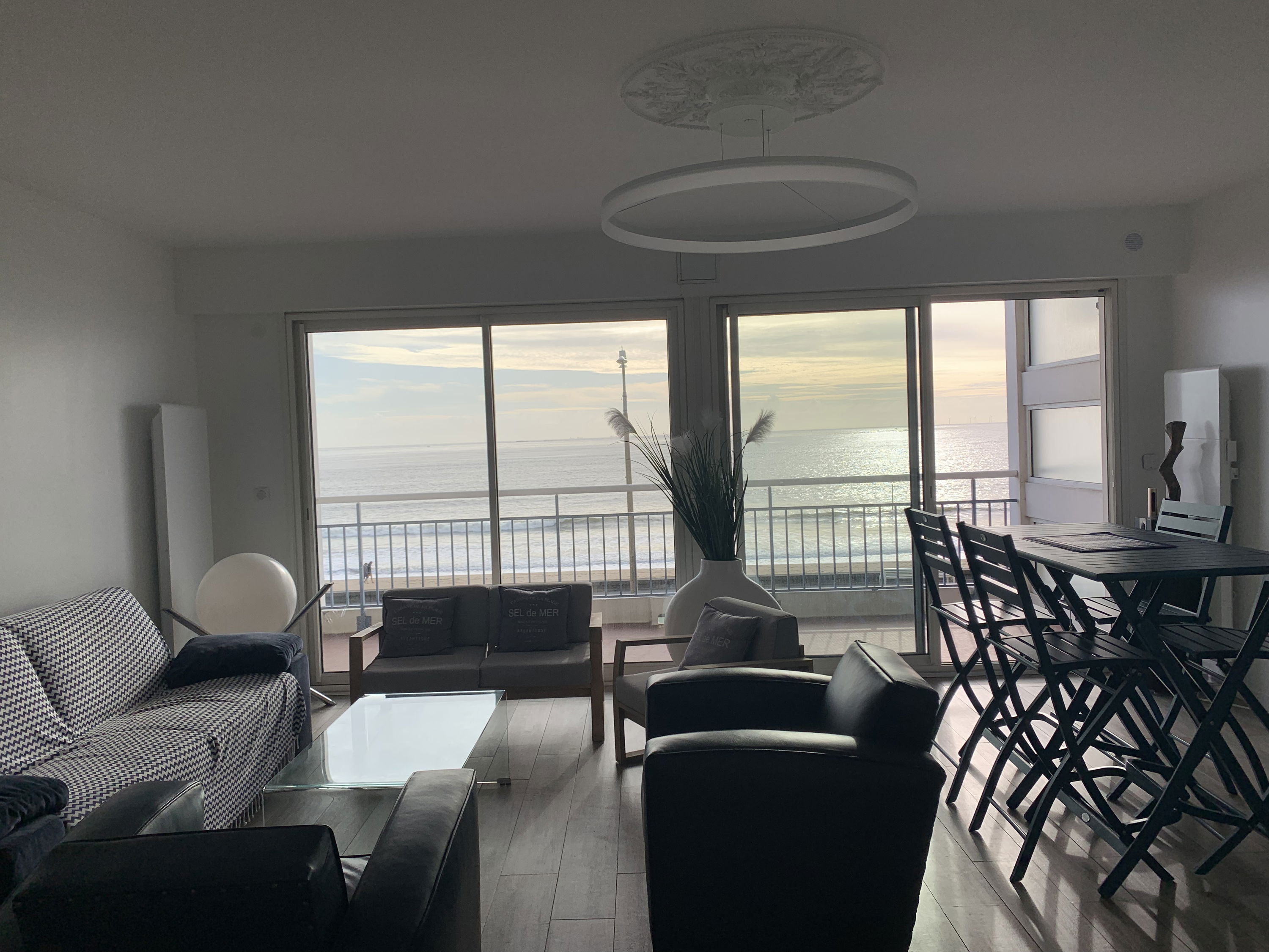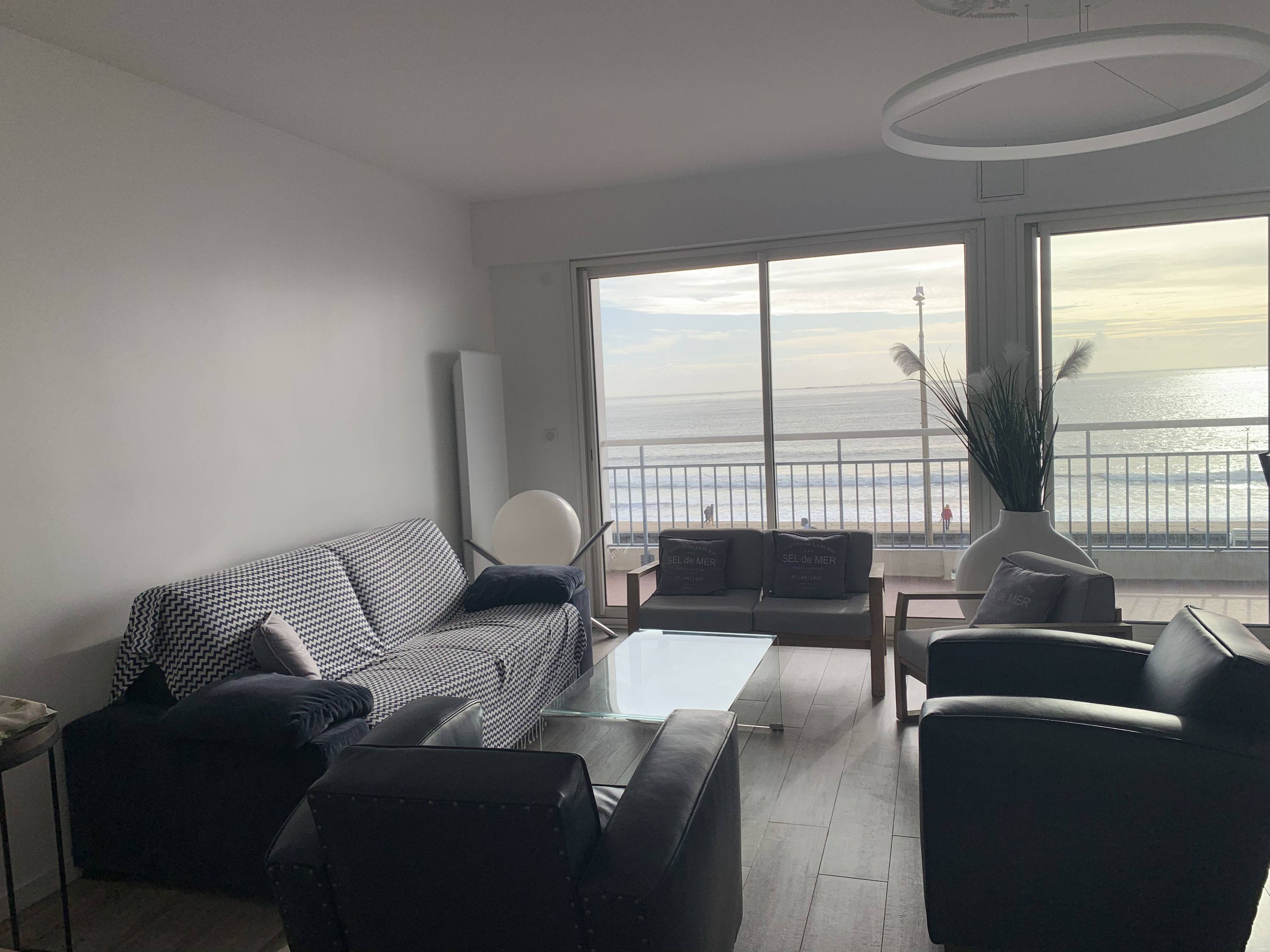 You will have an excellent stay in this renovated, comfortable apartment, facing the sea and close to the 2 main avenues of La Baule (avenue Lajarrige and avenue de Gaulle). Entrance - Beautiful living room (sofa bed 140/190, TV) opened by 2 bay windows onto terrace facing the sea with living room and removable high tables (outdoor/indoor) - US kitchen with dining area (induction hob, extractor, dishwasher 6 cutlery, oven, microwave, grain coffee maker, fridge/freezer) - Wc with washbasin - Bedroom n°1 with 160/190 bed, adjoining bathroom (towel dryer and washing machine) - Bedroom n° 2 with 160/190 bed, adjoining shower room and cupboard/wardrobe. Private parking in the basement. Wi-Fi Internet.