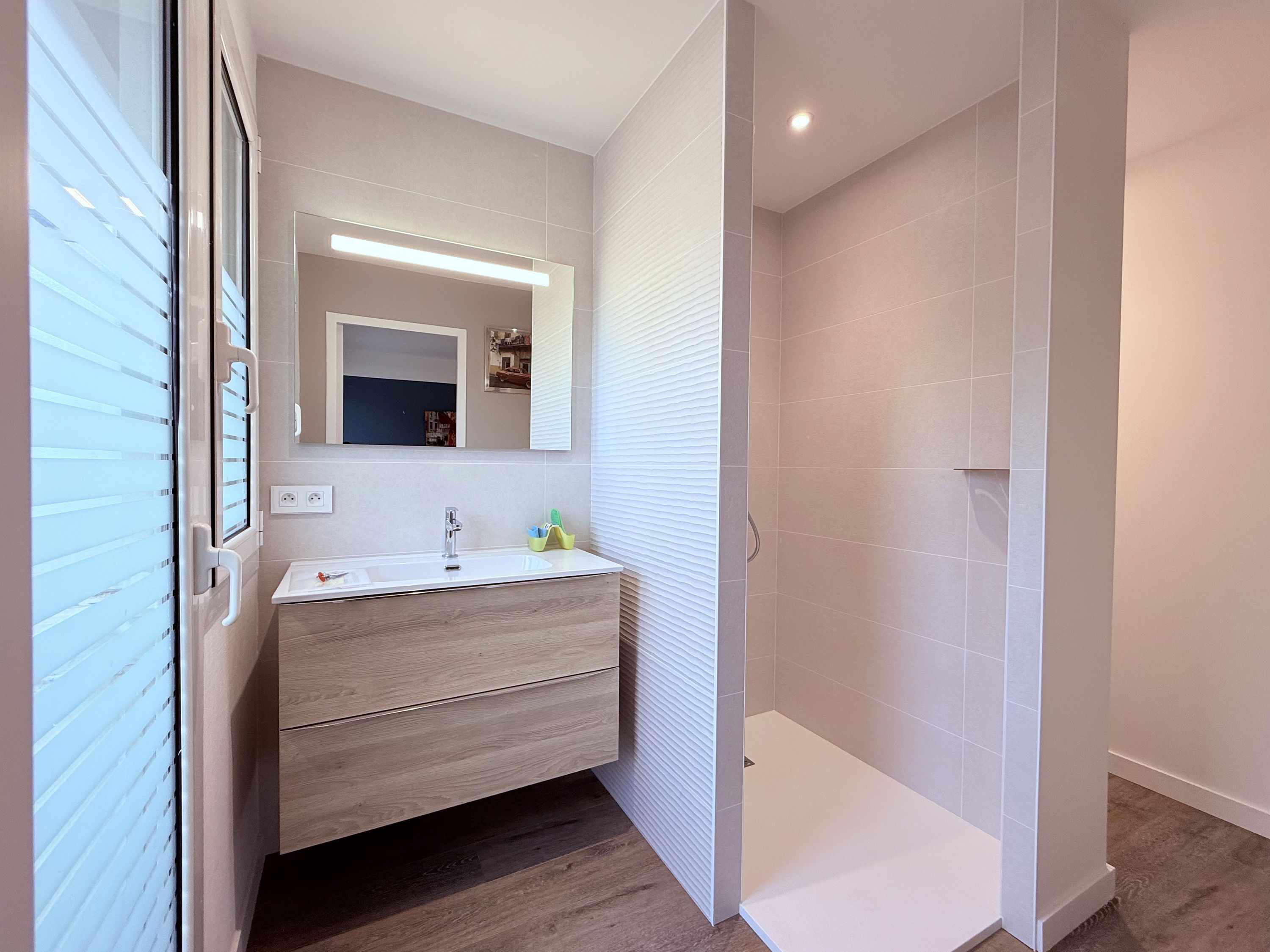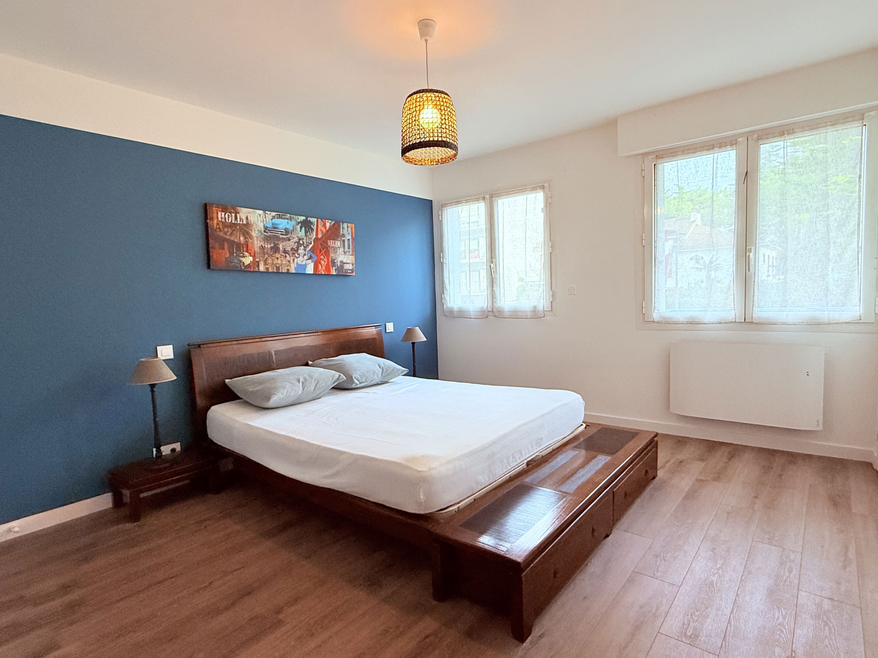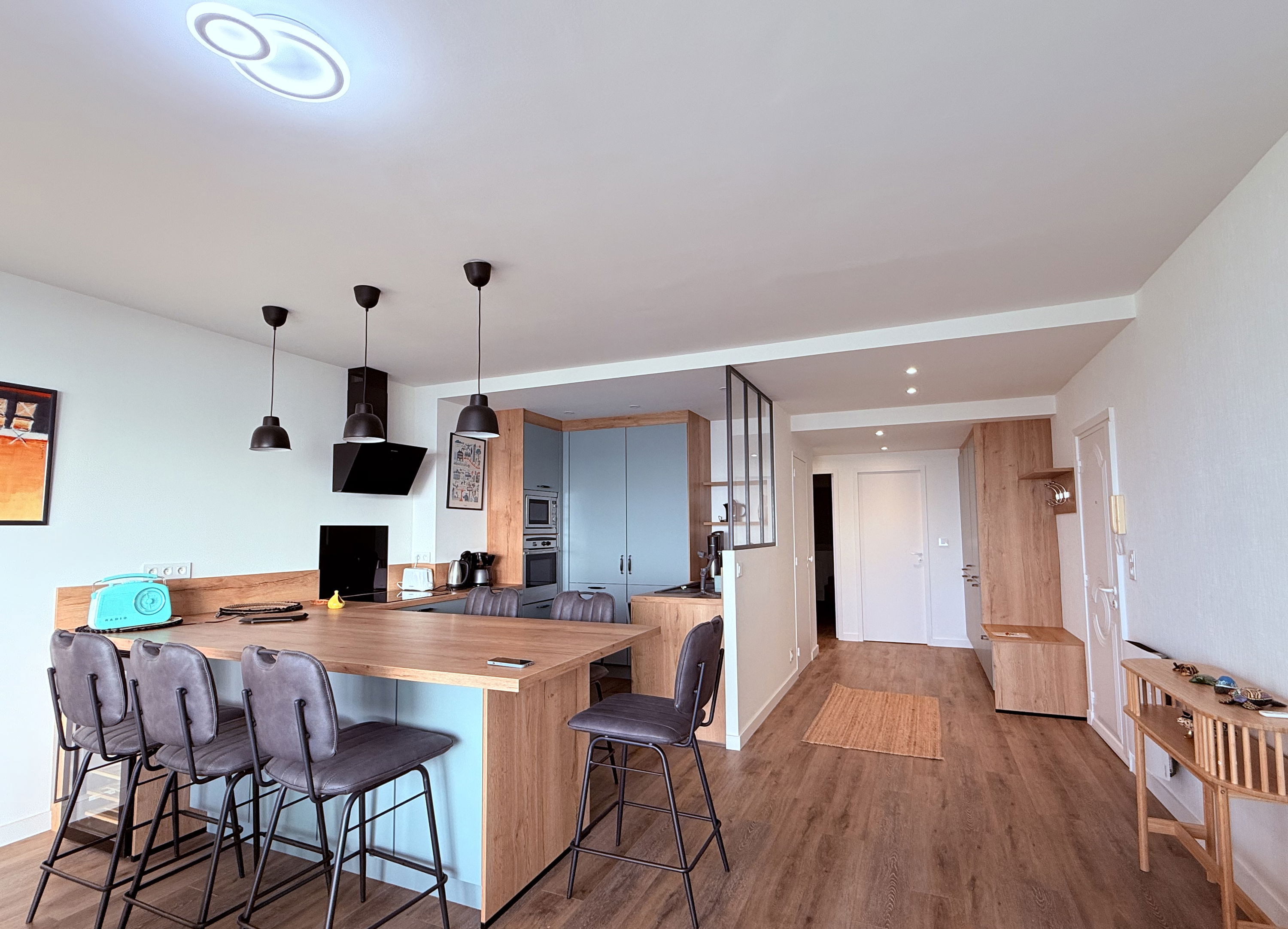 Entrance with cupboard - Equipped kitchen (ceramic hob, hood, filter coffee maker, kettle, toaster, oven, microwave, dishwasher) and open to the living room (180/200 sofa bed + TV + WIFI) - Bathroom with shower and washing machine - Separate WC - Bedroom 1 with 140/190 bed + cupboard/wardrobe - Master bedroom 2 with 160/190 bed + adjoining bathroom with access to a balcony (shower + dryer -towel) + desk + dressing room.