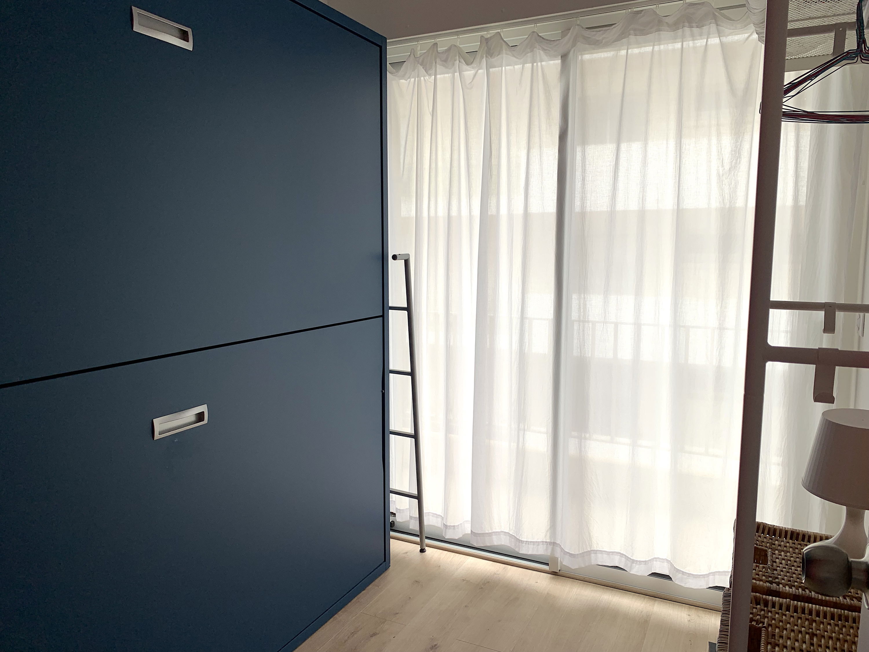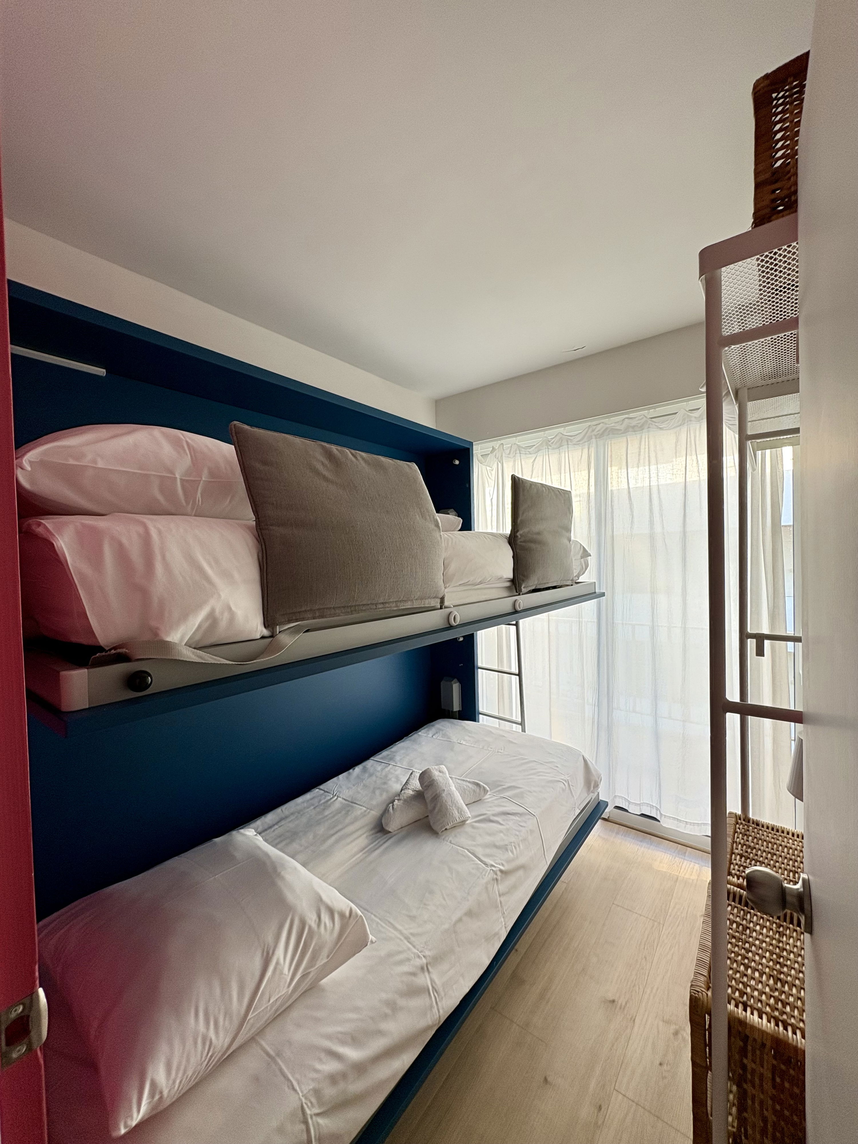 Entrance with cupboard/wardrobe - Living room consisting of an open and equipped kitchen (induction hob, central hood, fridge/freezer, oven, microwave, dishwasher, Nespresso, toaster and kettle, small wine cellar) and living room with flat screen TV, 160/200 sofa bed and WIFI connection - Bedroom 1 (small) with 2 90/200 foldaway beds and wardrobe - Bathroom with towel dryer and washer-dryer - Bedroom 2 with 160/160 bed 200 and cupboard/wardrobe - separate WC.