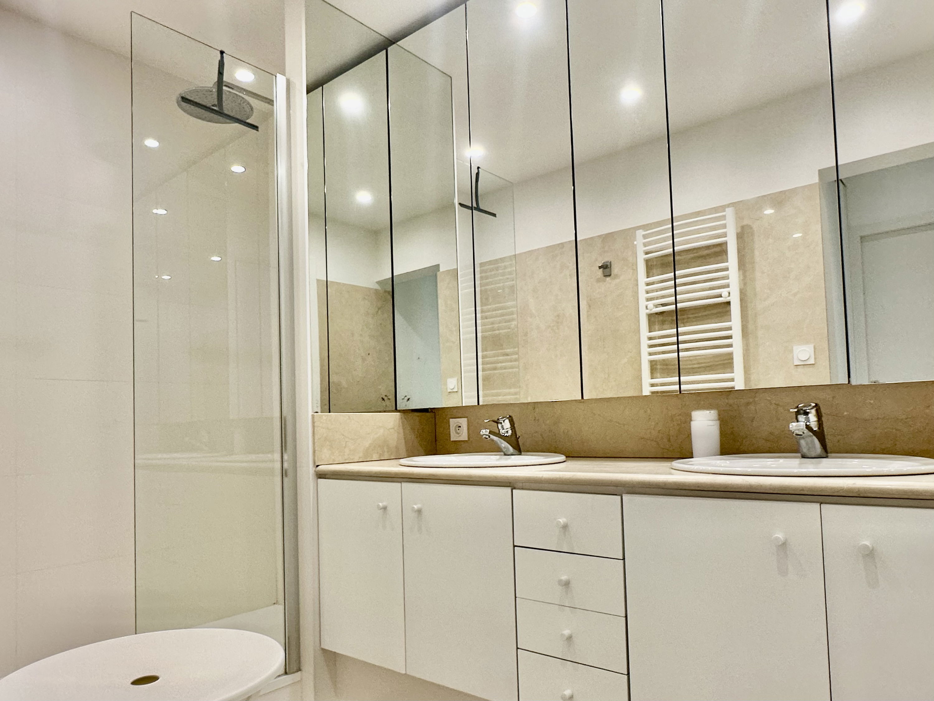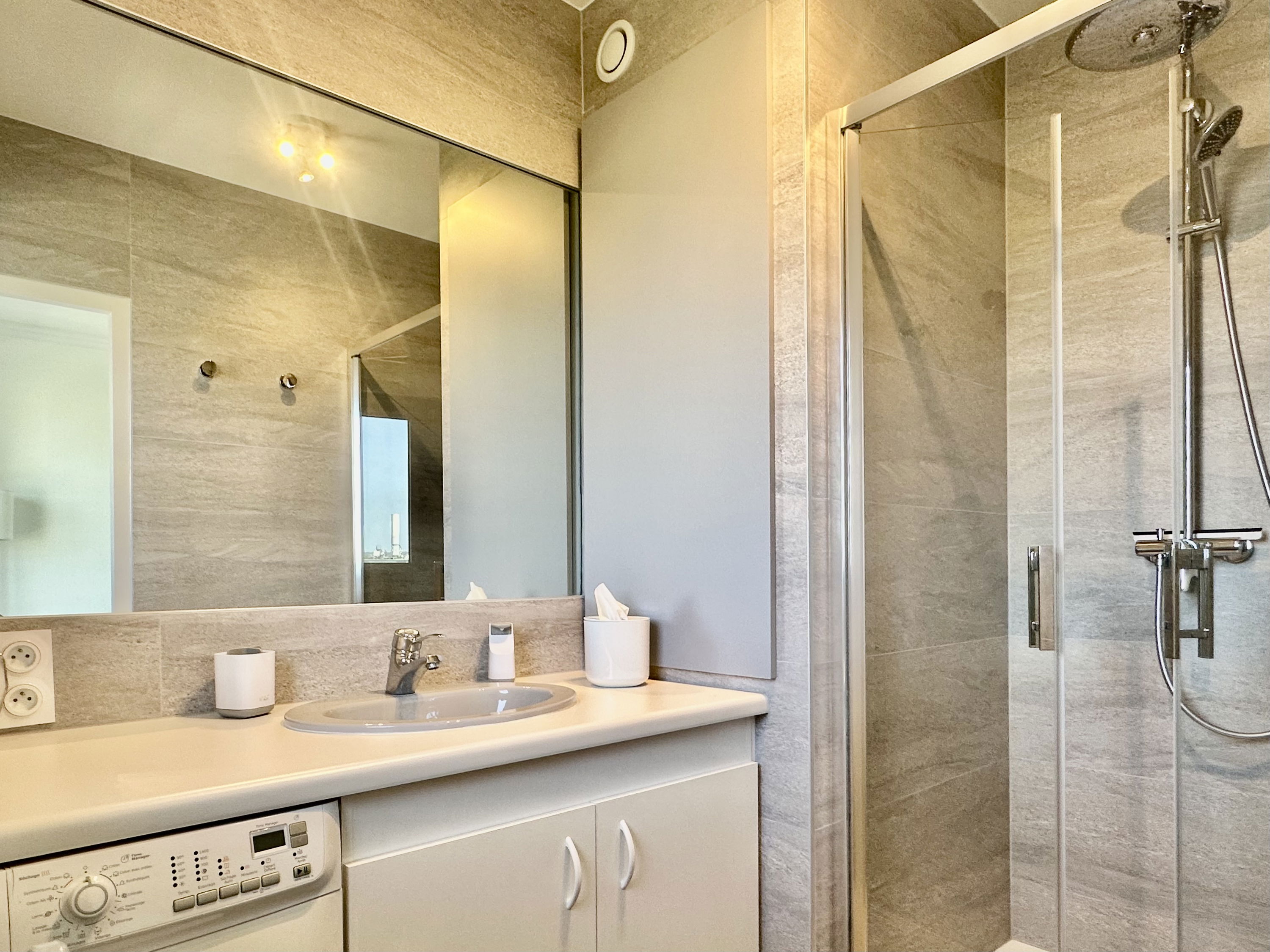 • Bedroom 2: a 160x200 cm bed, TV, storage and access to the balcony + shower room with double sink and cupboard.
