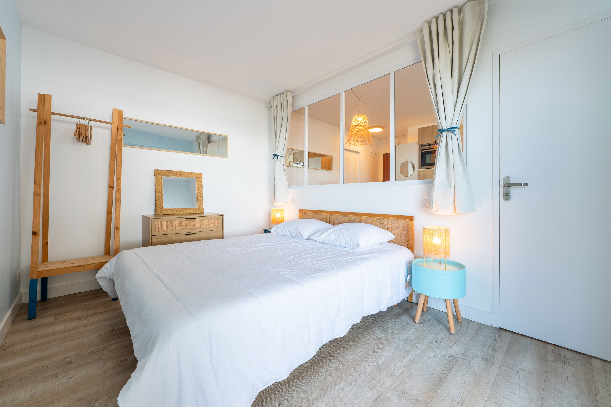 Bedroom with double bed (140x190), storage and glass partition overlooking the kitchen.