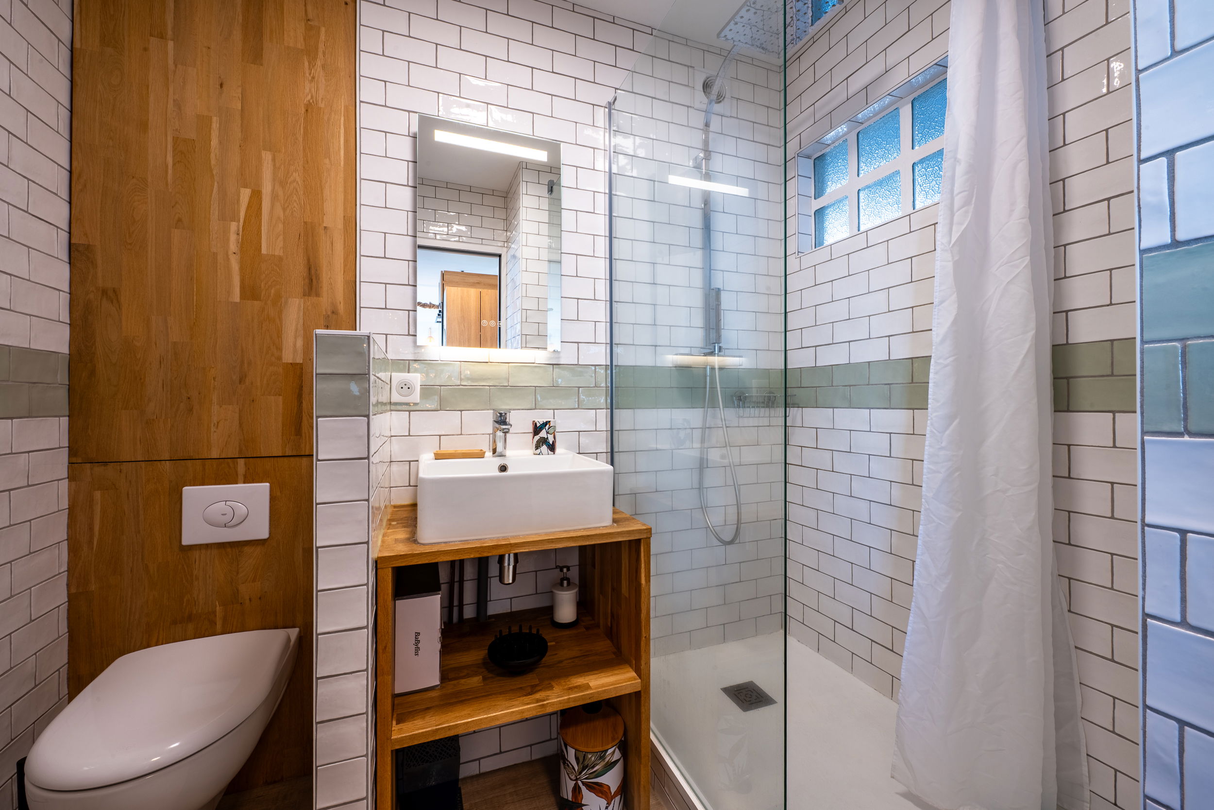 Modern bathroom with walk-in shower, wooden sink and toilet.