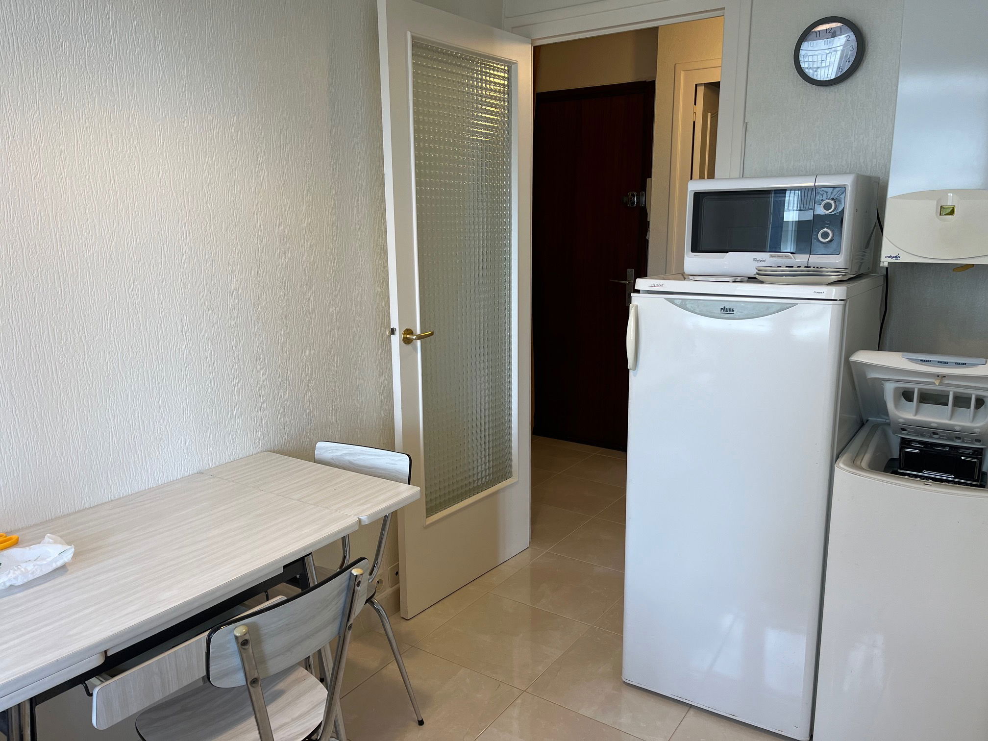 refrigerator with freezer, gas cooker with oven, microwave, washing machine, toaster, kettle and Nespresso machine.