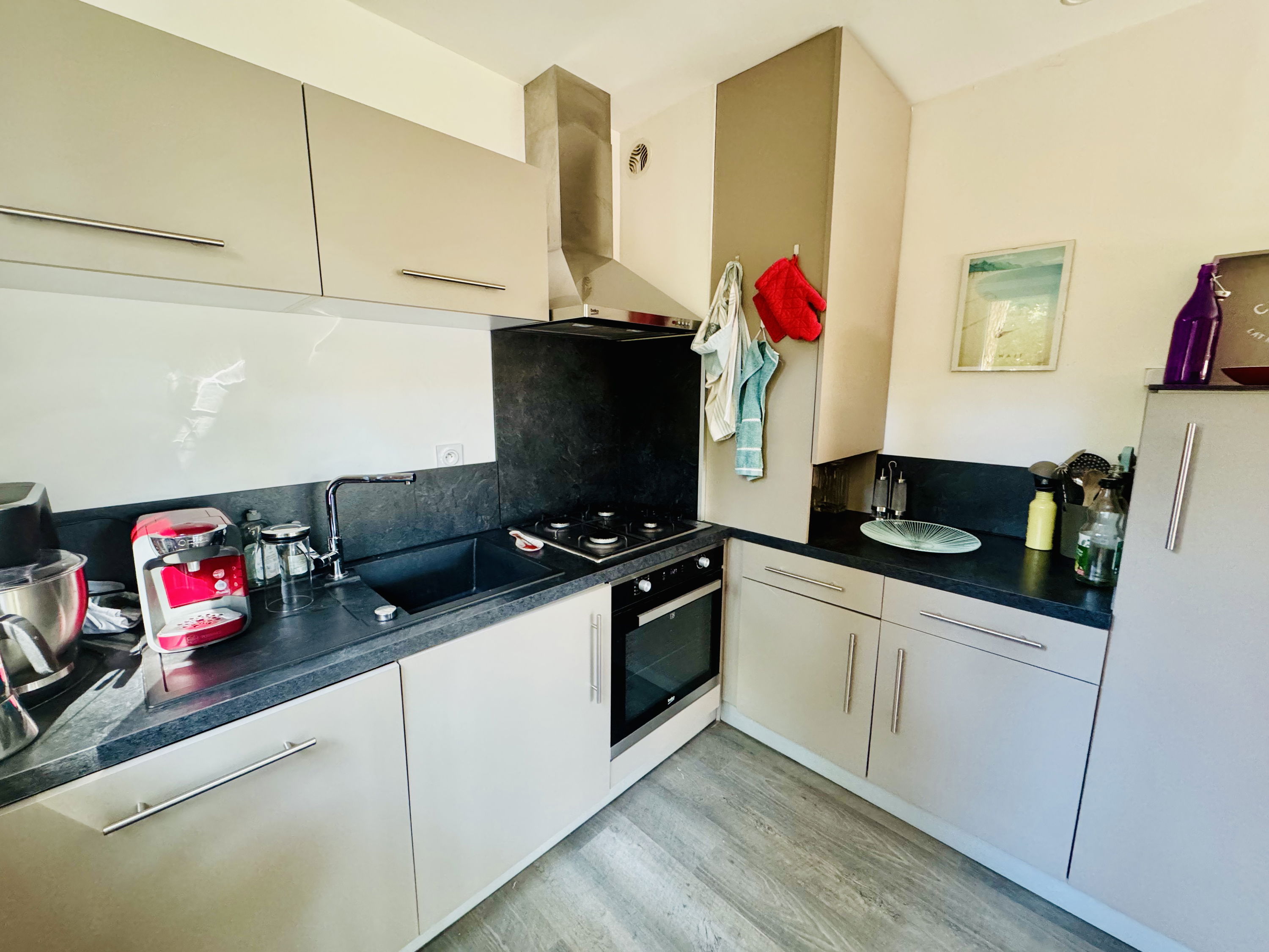 The open kitchen is fully equipped for your comfort: gas hob, dishwasher, refrigerator with freezer, Tassimo machine, food processor, toaster, kettle and extractor hood.