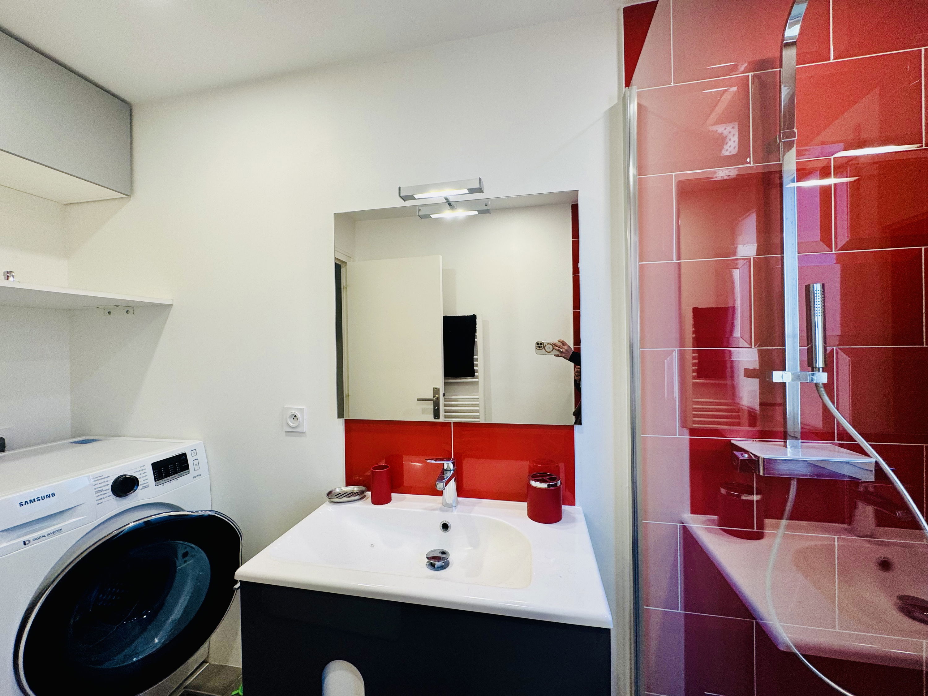 A modern bathroom with a large shower, natural light, vanity unit, towel warmer and washer-dryer