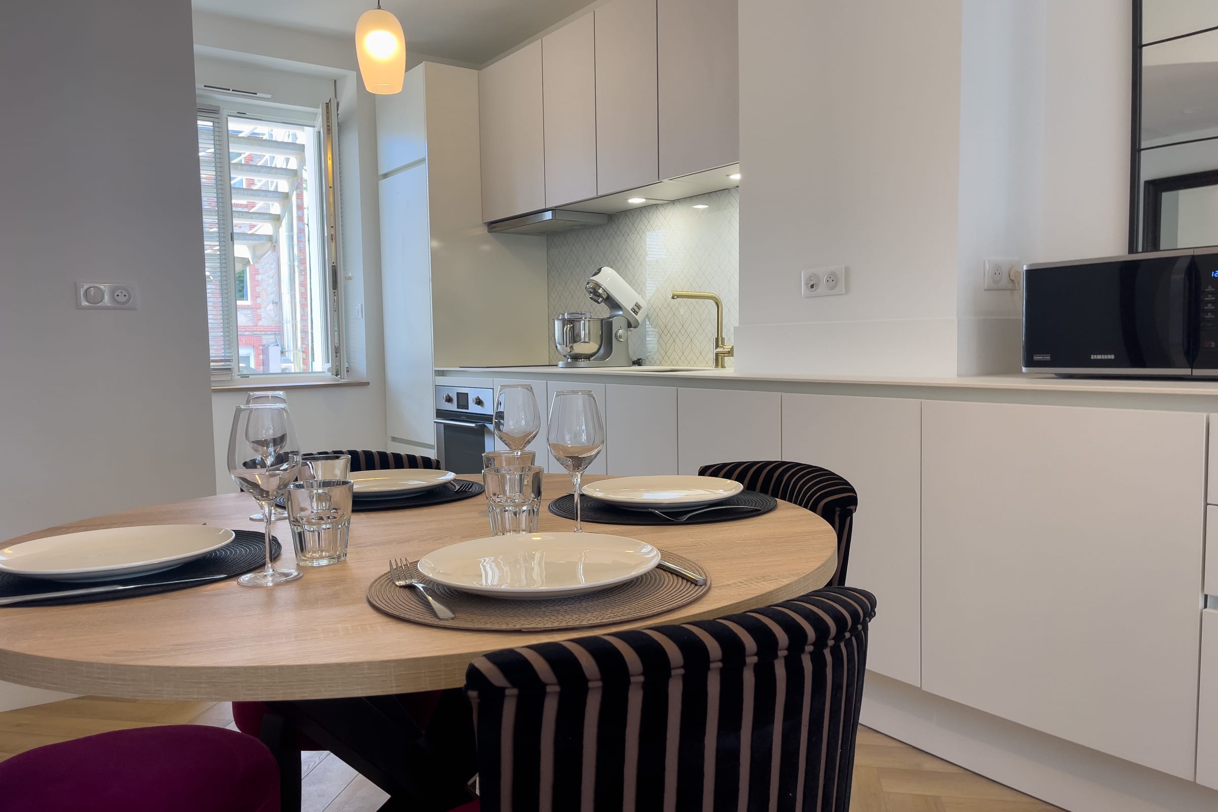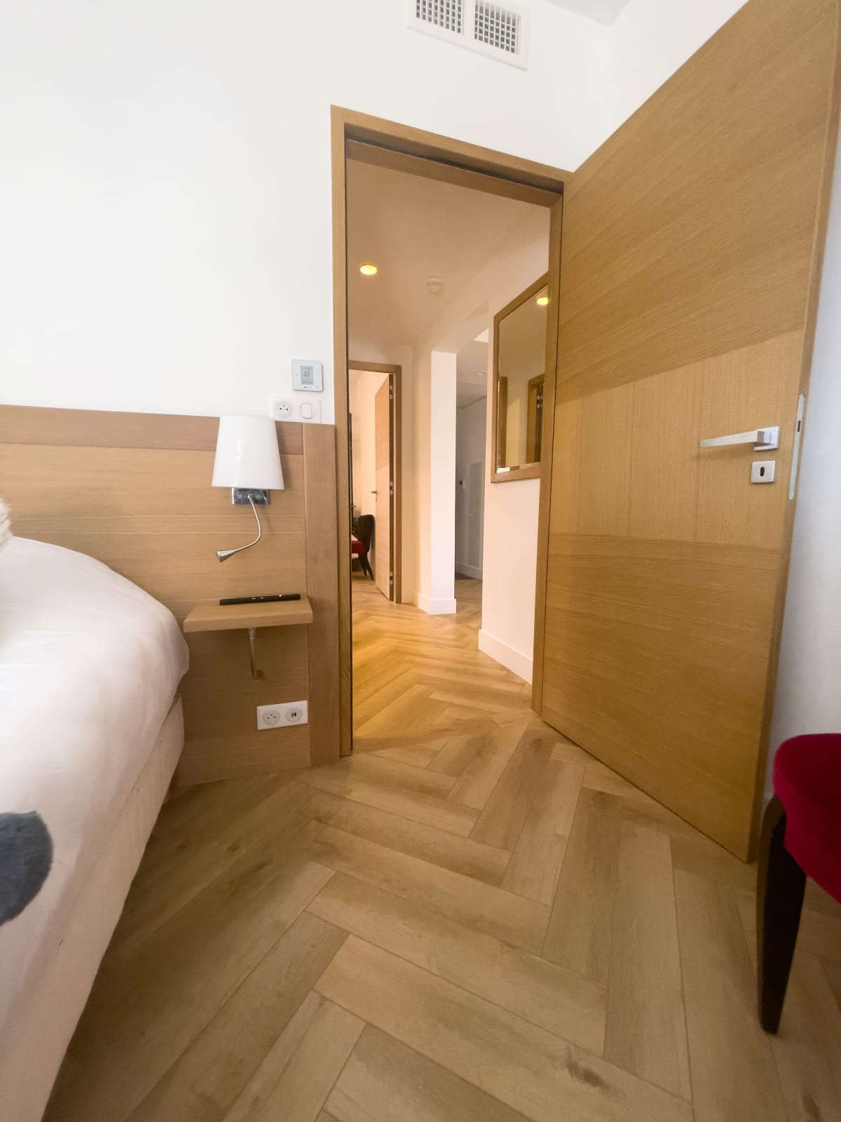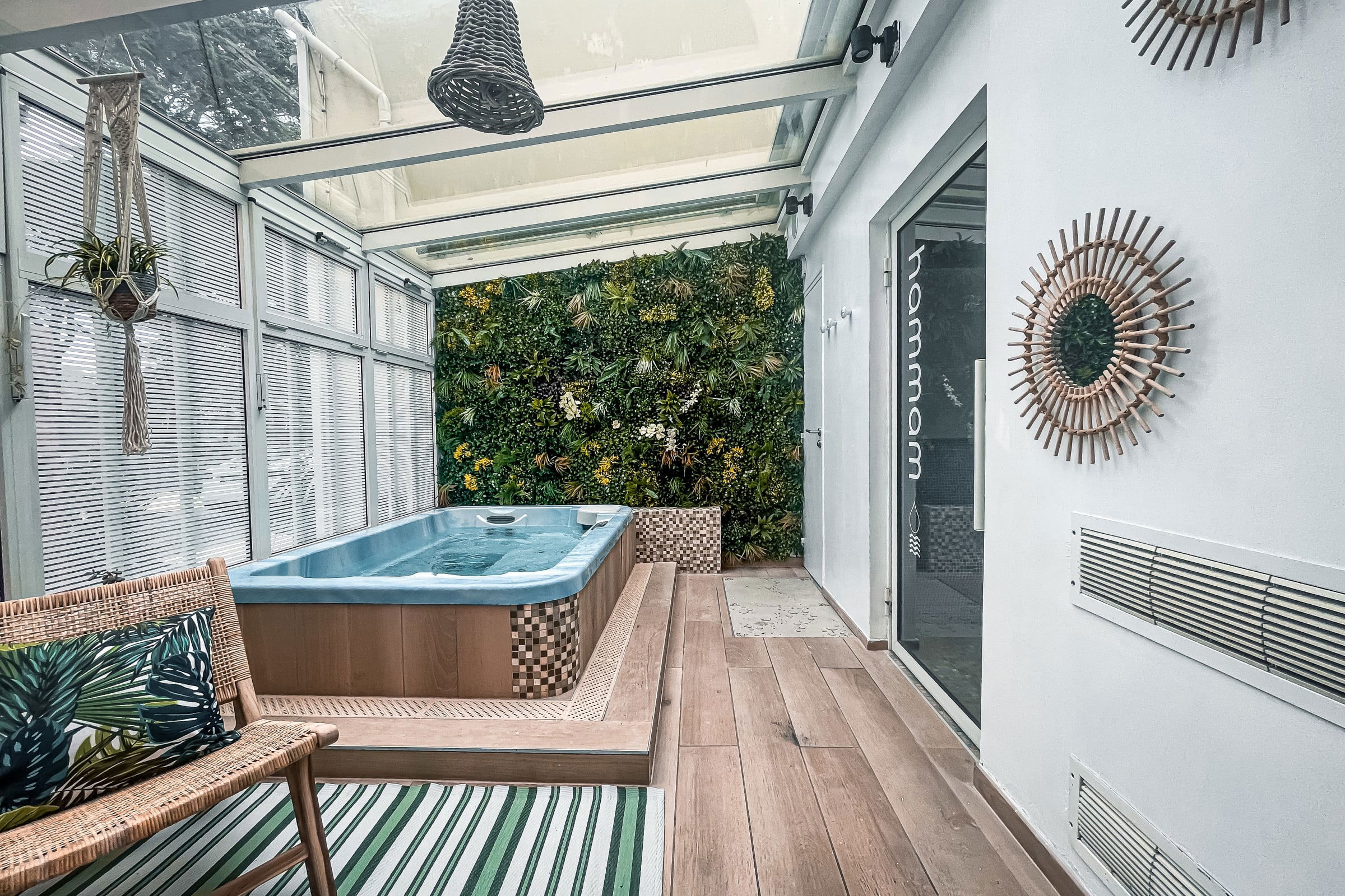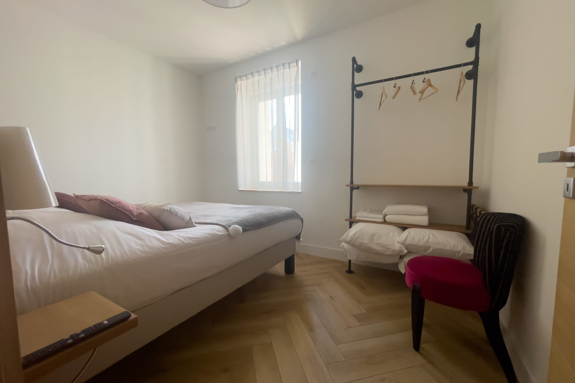 Flat on the floor of a century-old building. This flat has a view on the pine trees and the sea. It consists of two bedrooms with a view of the pine trees and the typical seaside villas of Pornichet, a bathroom with shower and private toilet. The living room can accommodate 2 additional beds (sofa bed). It is equipped with a complete kitchen, oven, microwave, dishwasher, fridge, freezer, cooking and serving equipment for 5 people. This accommodation is equipped with a washing machine. All rooms are air-conditioned and wifi is available throughout the flat. Access is via an outside staircase and offers an outside terrace common to this villa. A parking space is available as well as access to the spa-hammam, subject to availability, on request and with an extra charge.