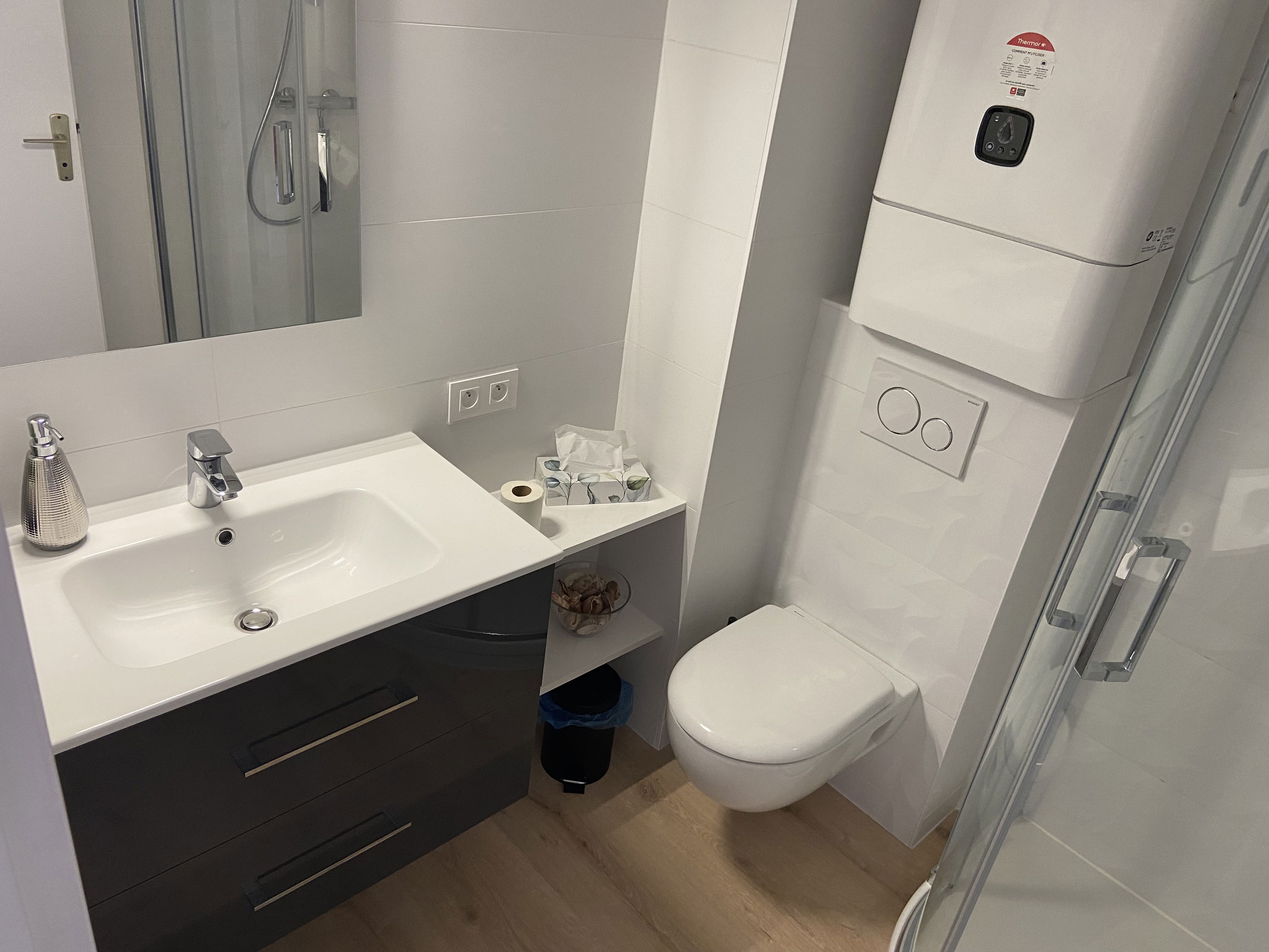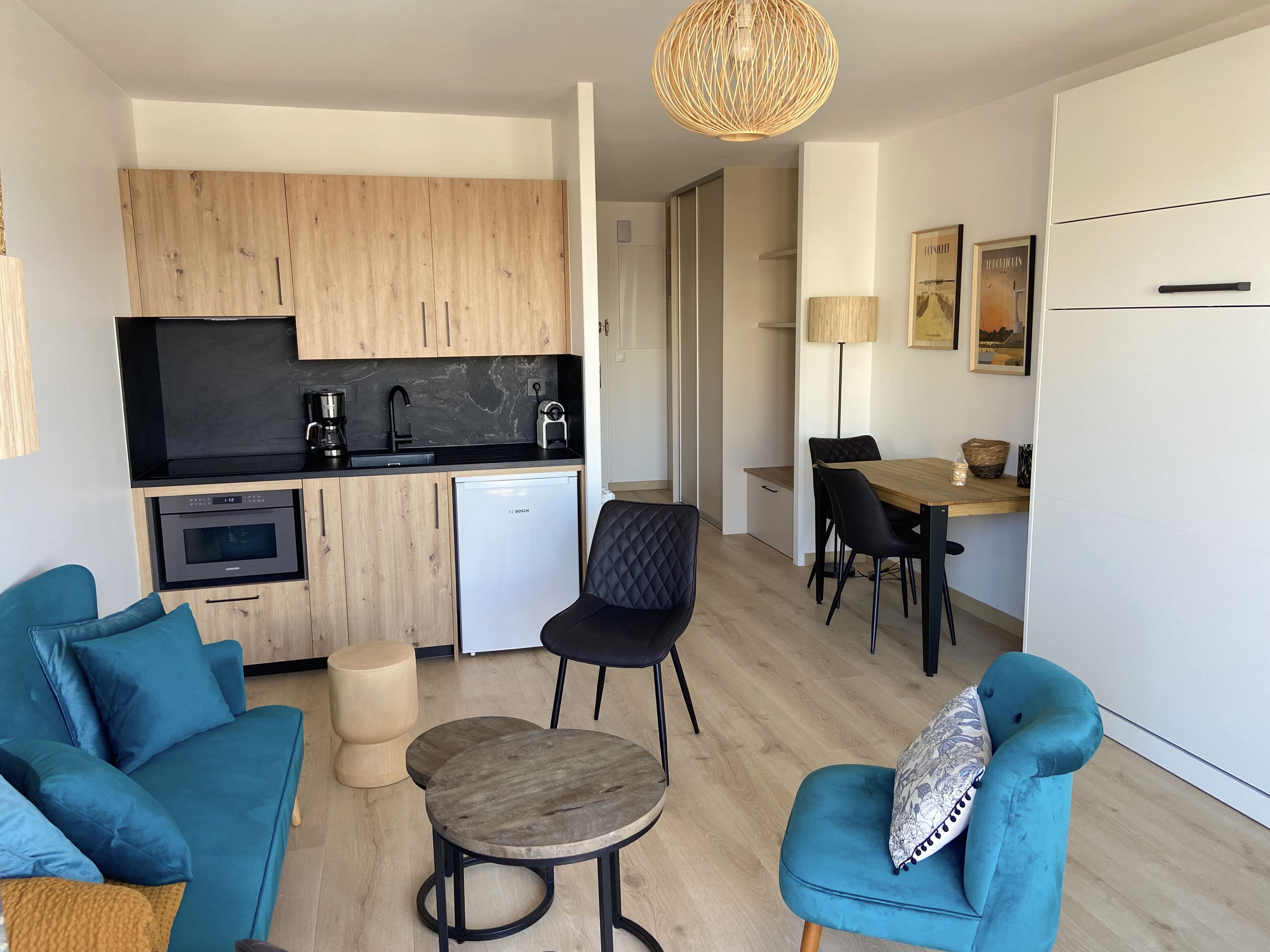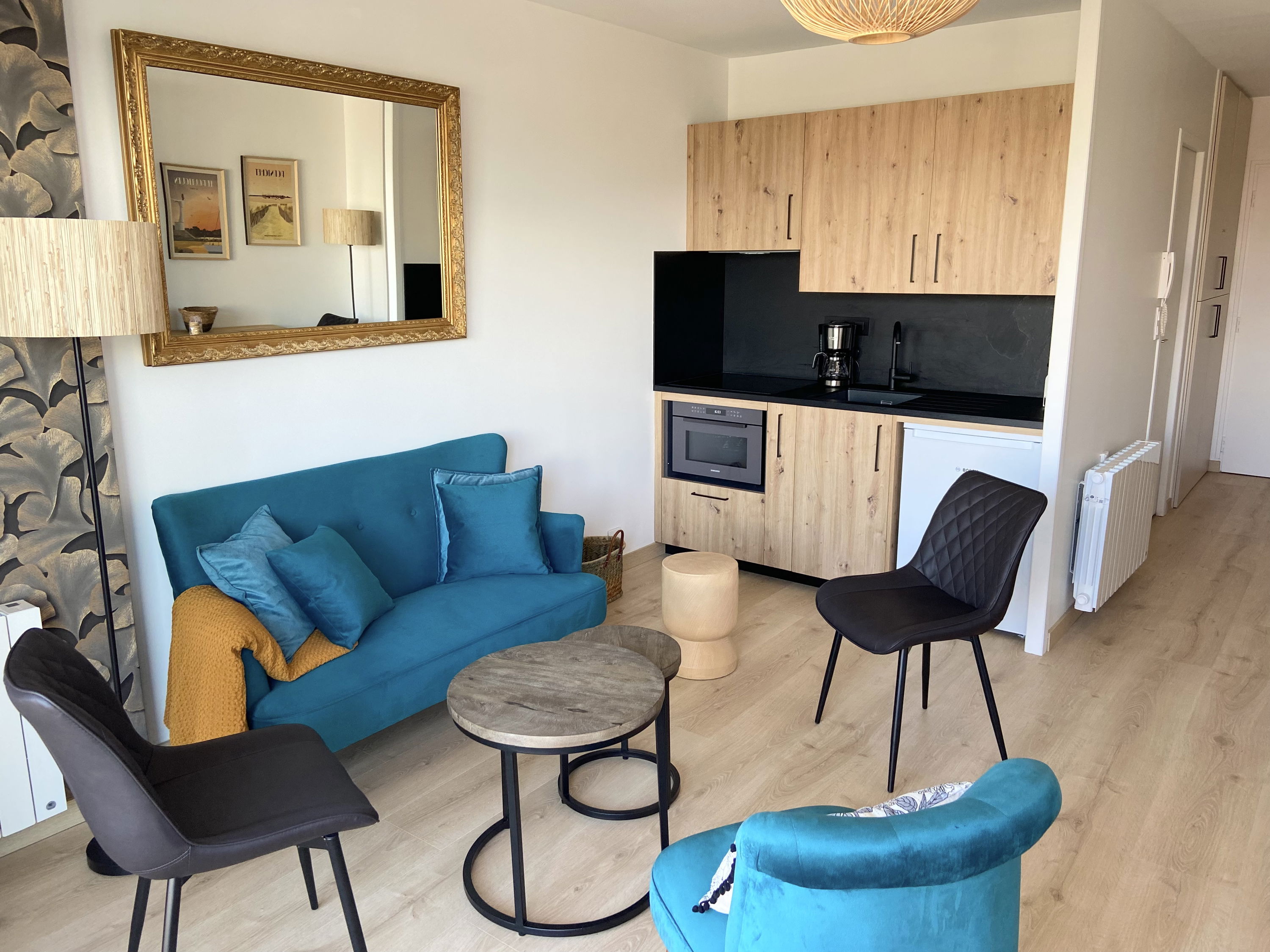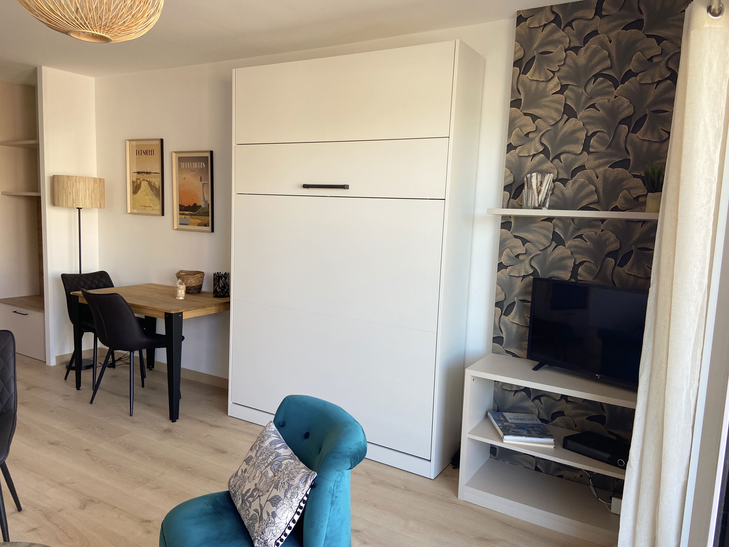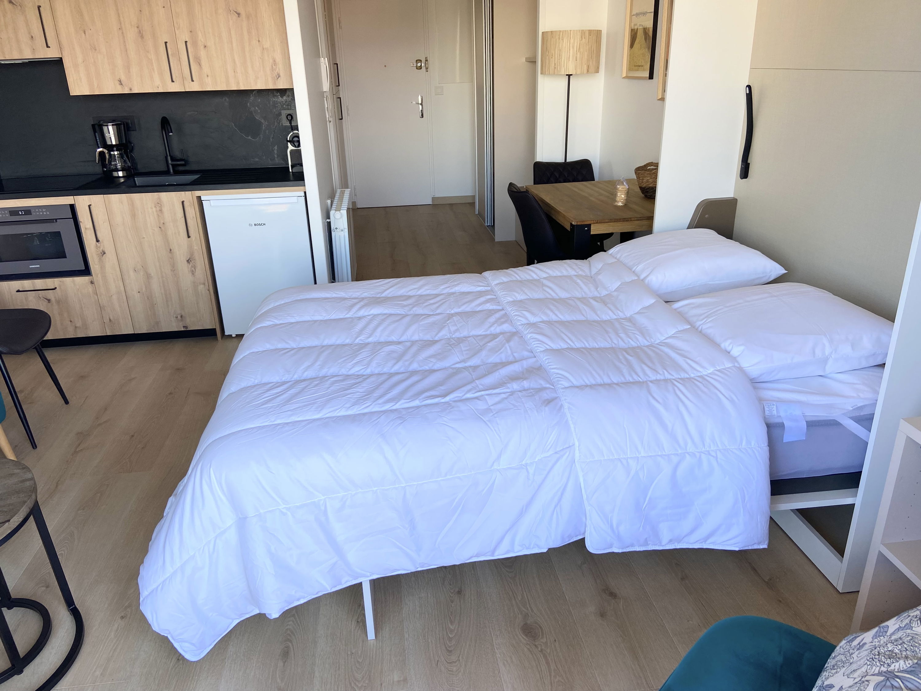 - Kitchenette area (fridge/freezer - filter coffee maker - Nespresso coffee maker - Combined microwave oven - toaster - vitro hob - hood) open to the living room (TV) with terrace access facing the bay of La Baule