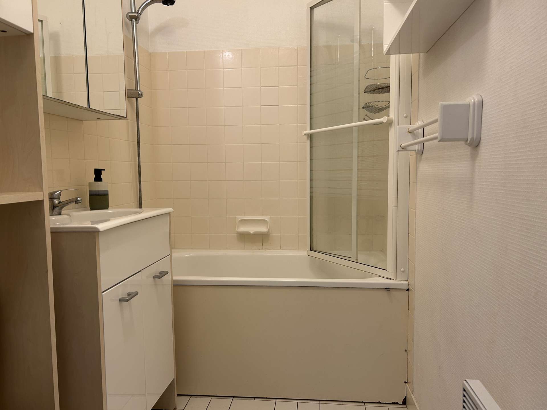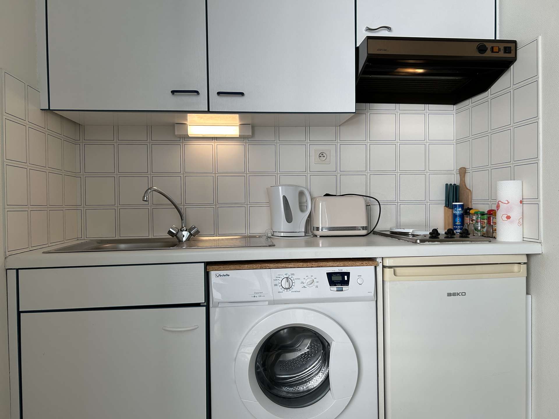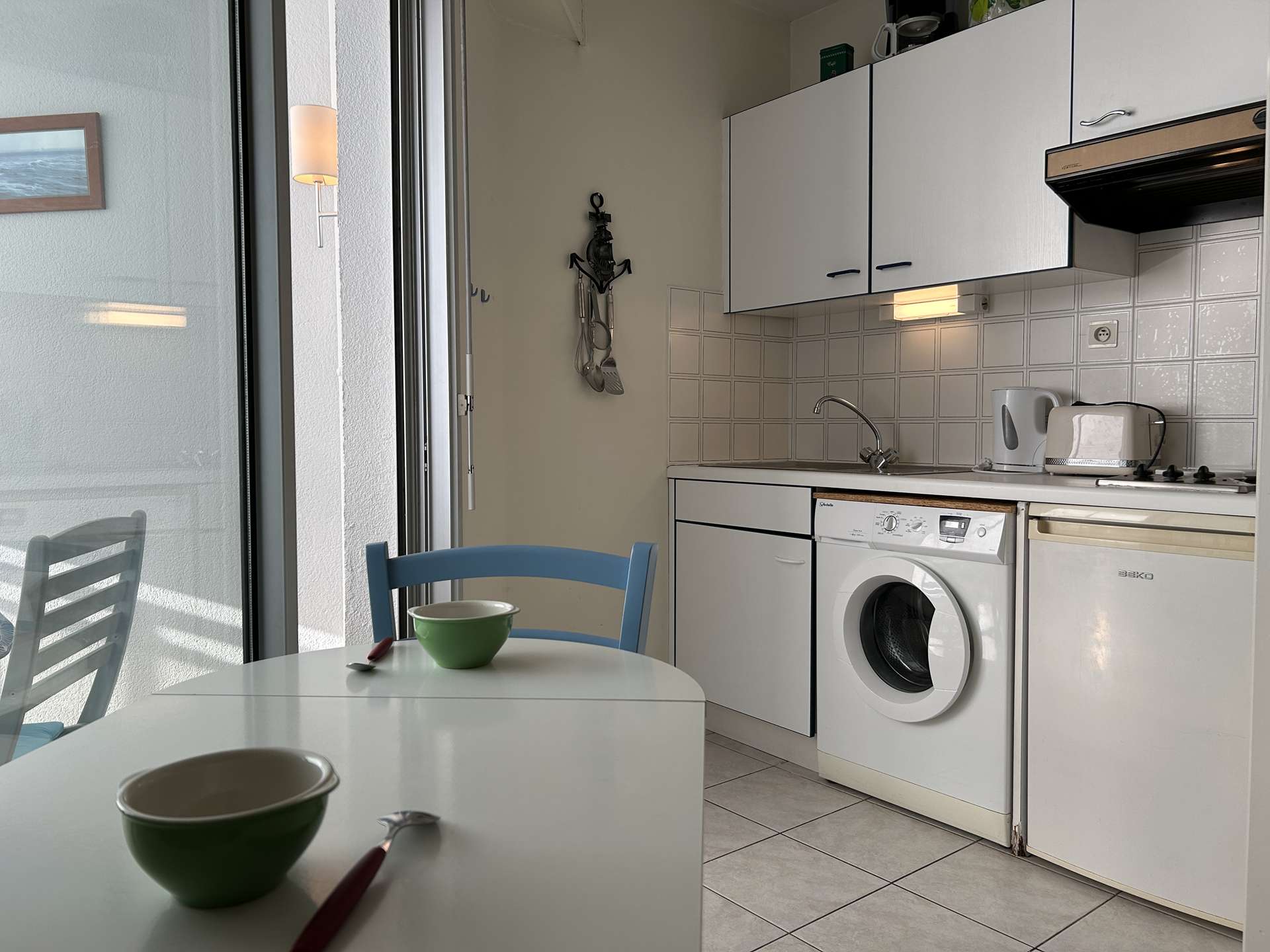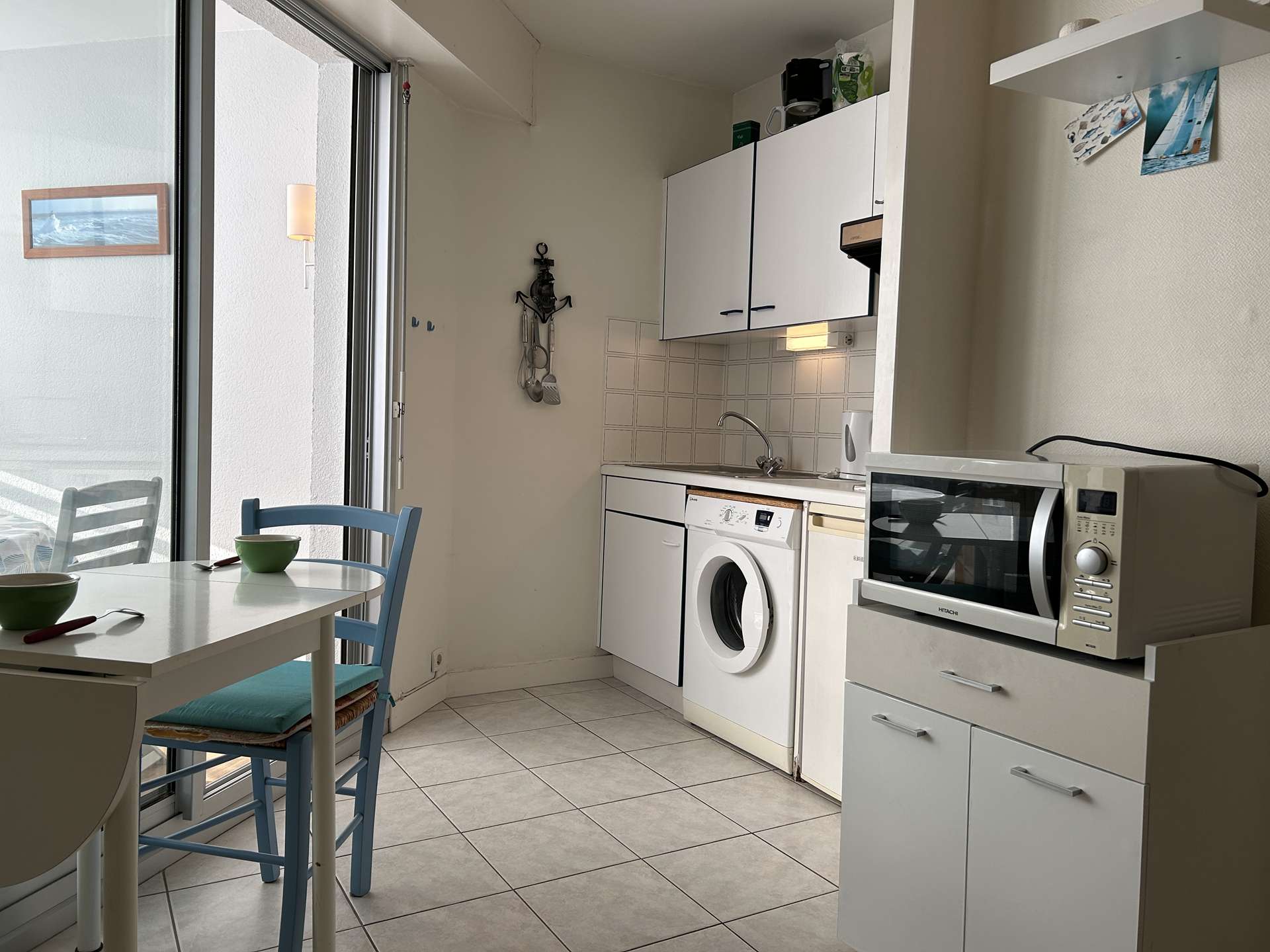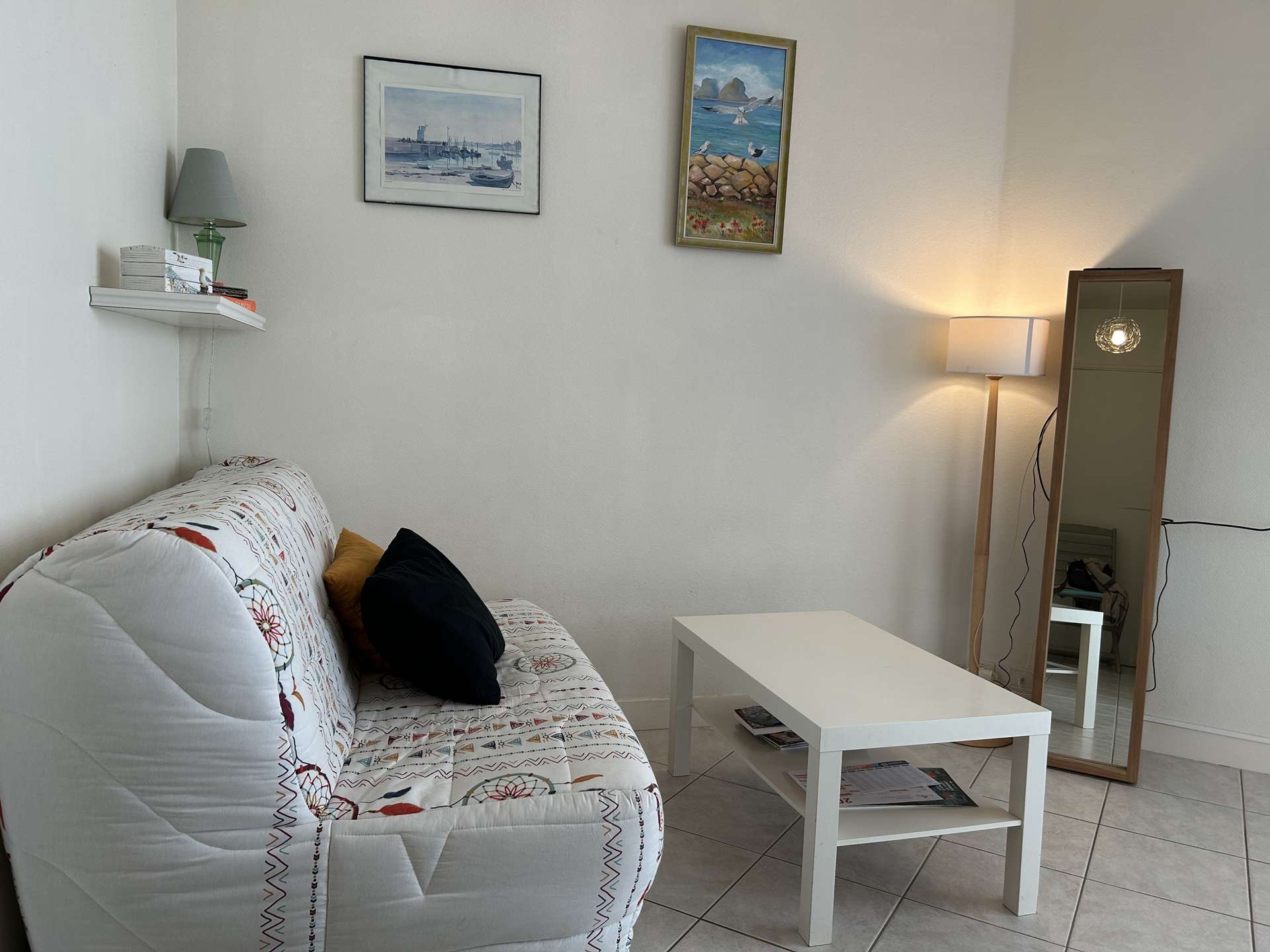 Located just steps from the beach and the port of Pornichet, this apartment is perfect for a couple's or family holiday. It includes an entrance hall and a bathroom with a toilet. The entrance opens onto a bright living room with a fully equipped kitchenette, a sofa bed, and a loggia overlooking the shared garden.
