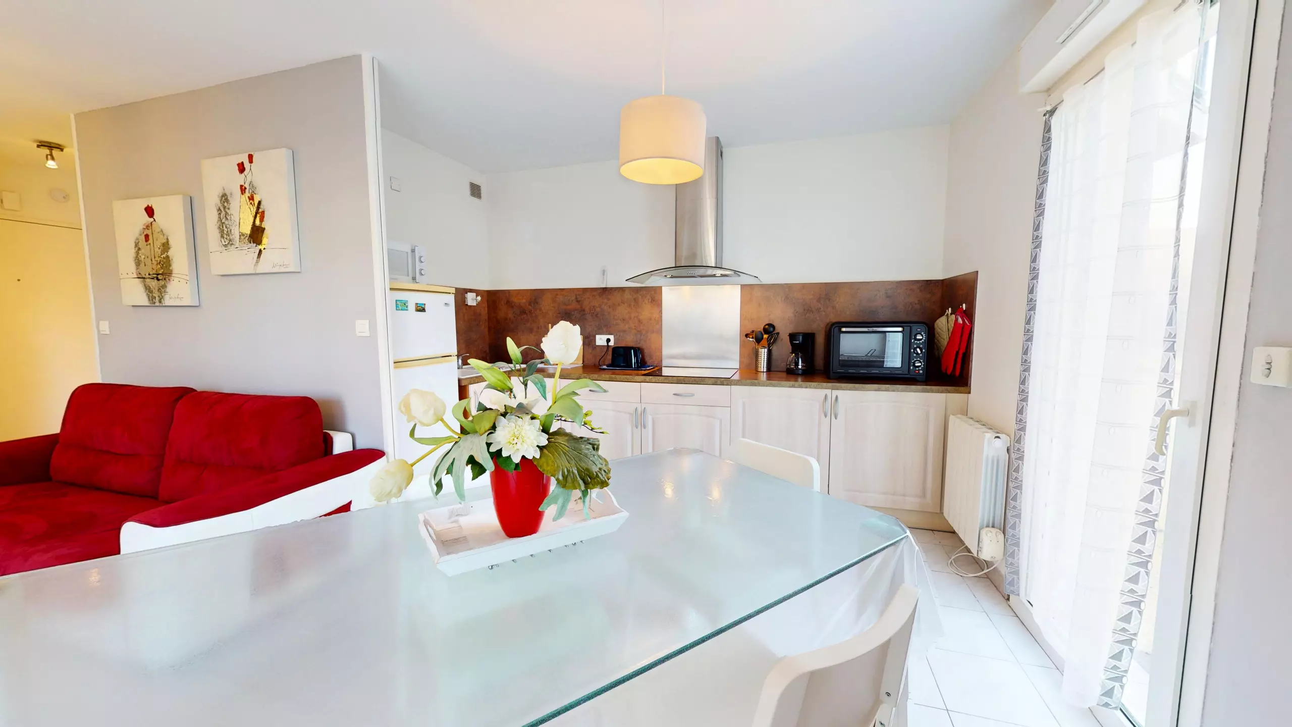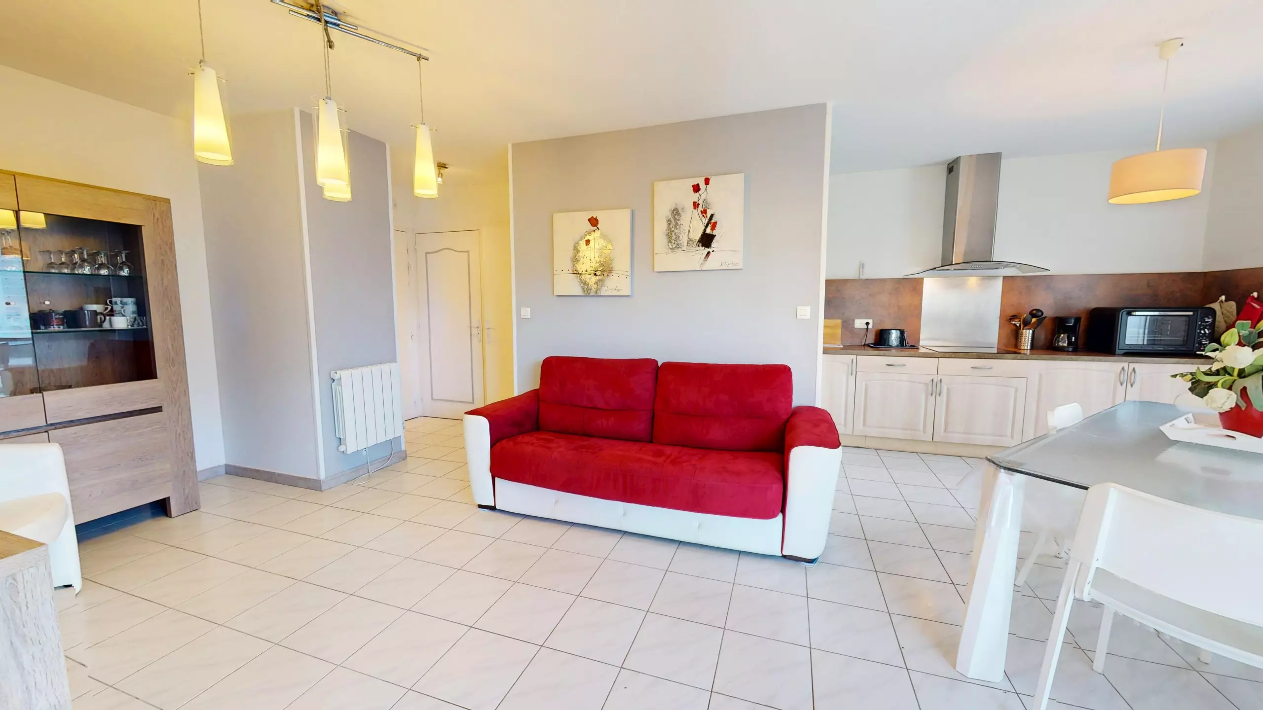 You will then enjoy a beautiful dining room with a table, as well as a large, fully equipped open kitchen with induction hobs and everything you need to prepare your meals independently.