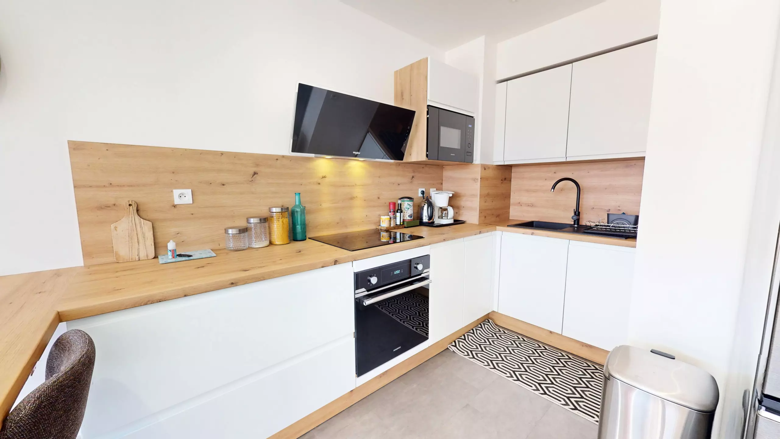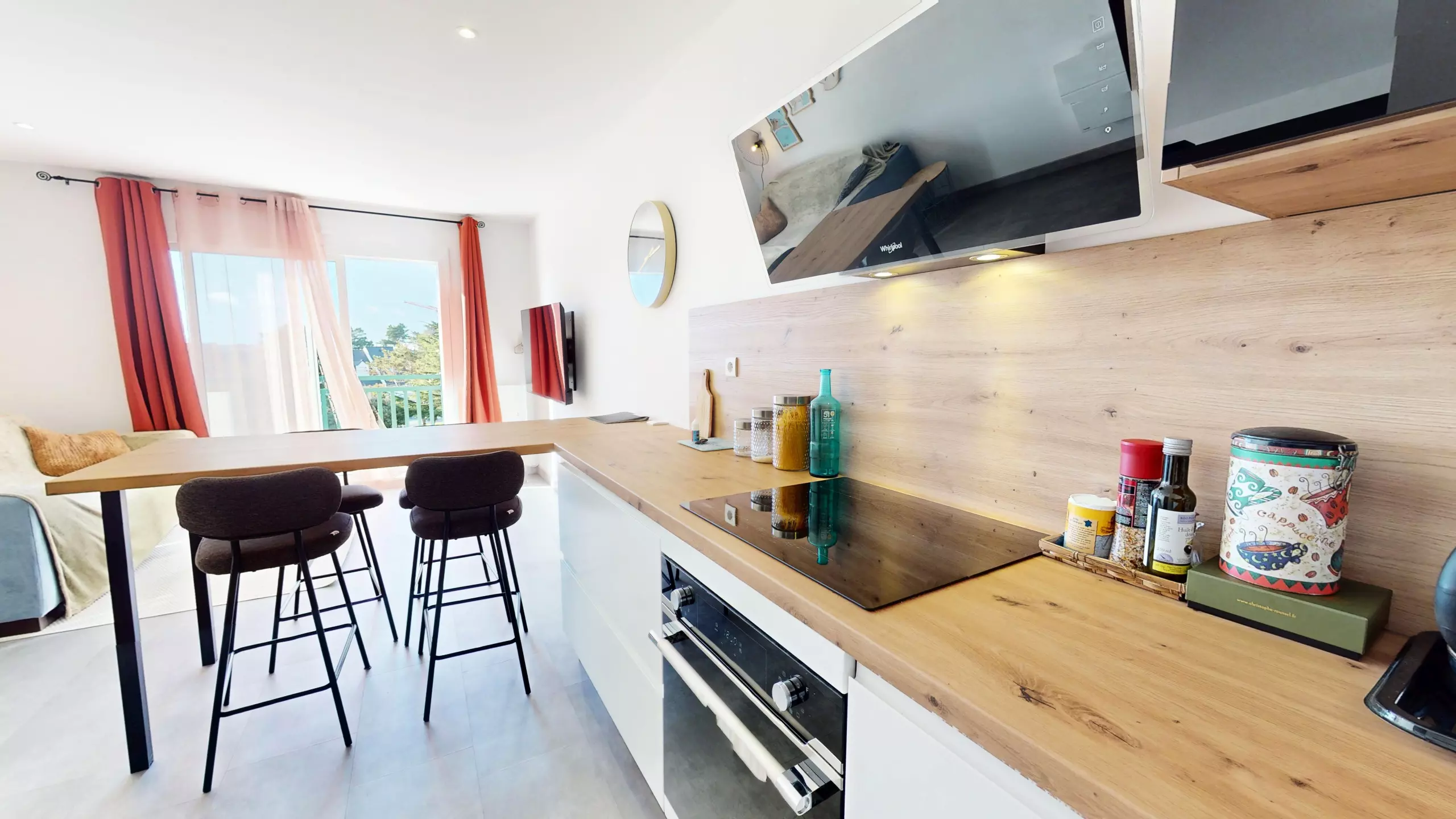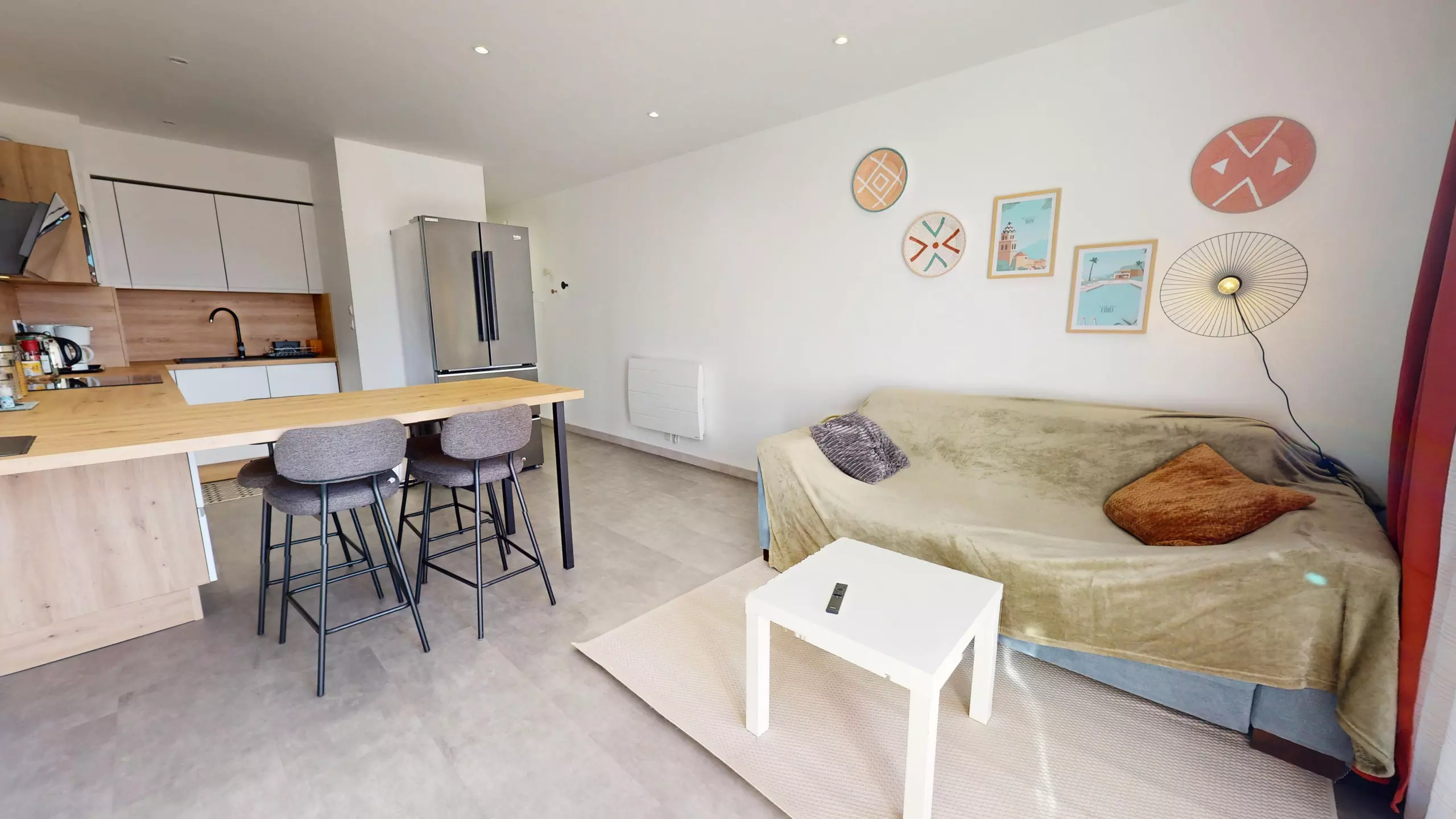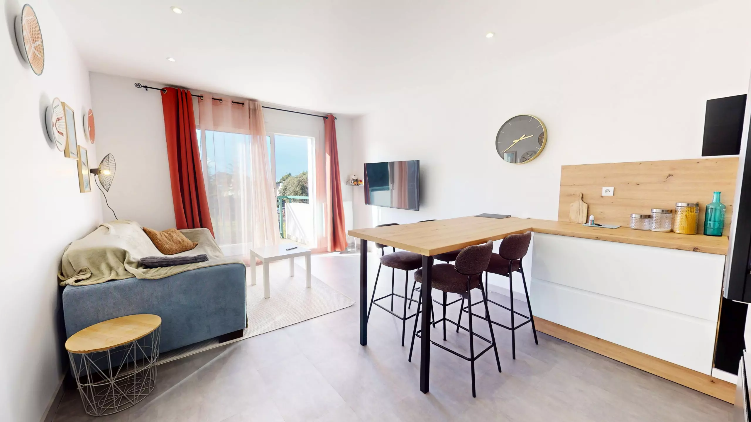 This 39 m² apartment, designed to accommodate up to 4 people, offers a perfect balance between comfort and modern style. Upon entering, you'll discover a bright and spacious living area, comprising a cozy lounge with a 140x190 double sofa bed, a television, and a fully equipped, modern open-plan kitchen with a mini-bar and stools – ideal for sharing good times over a meal or drinks.