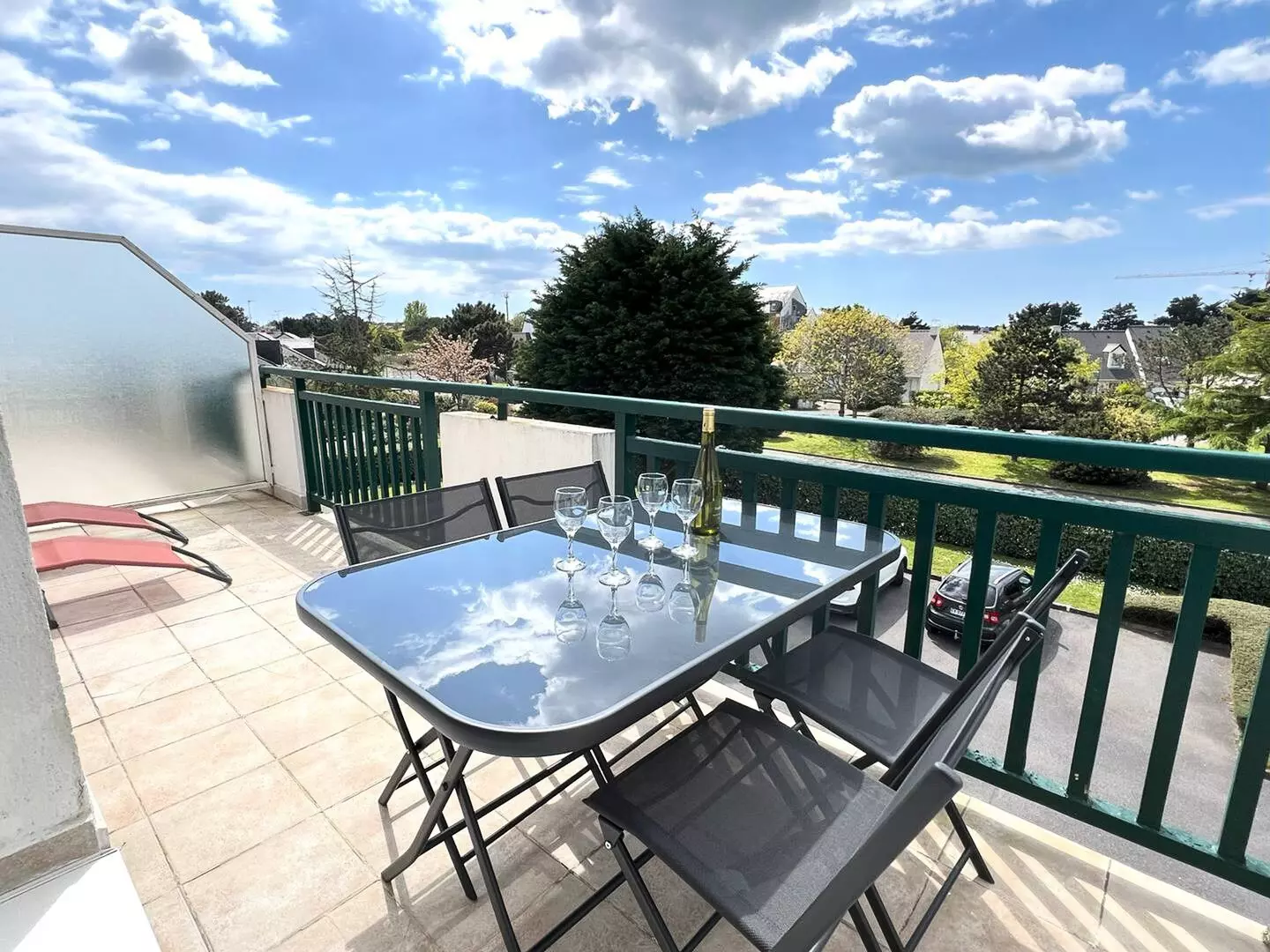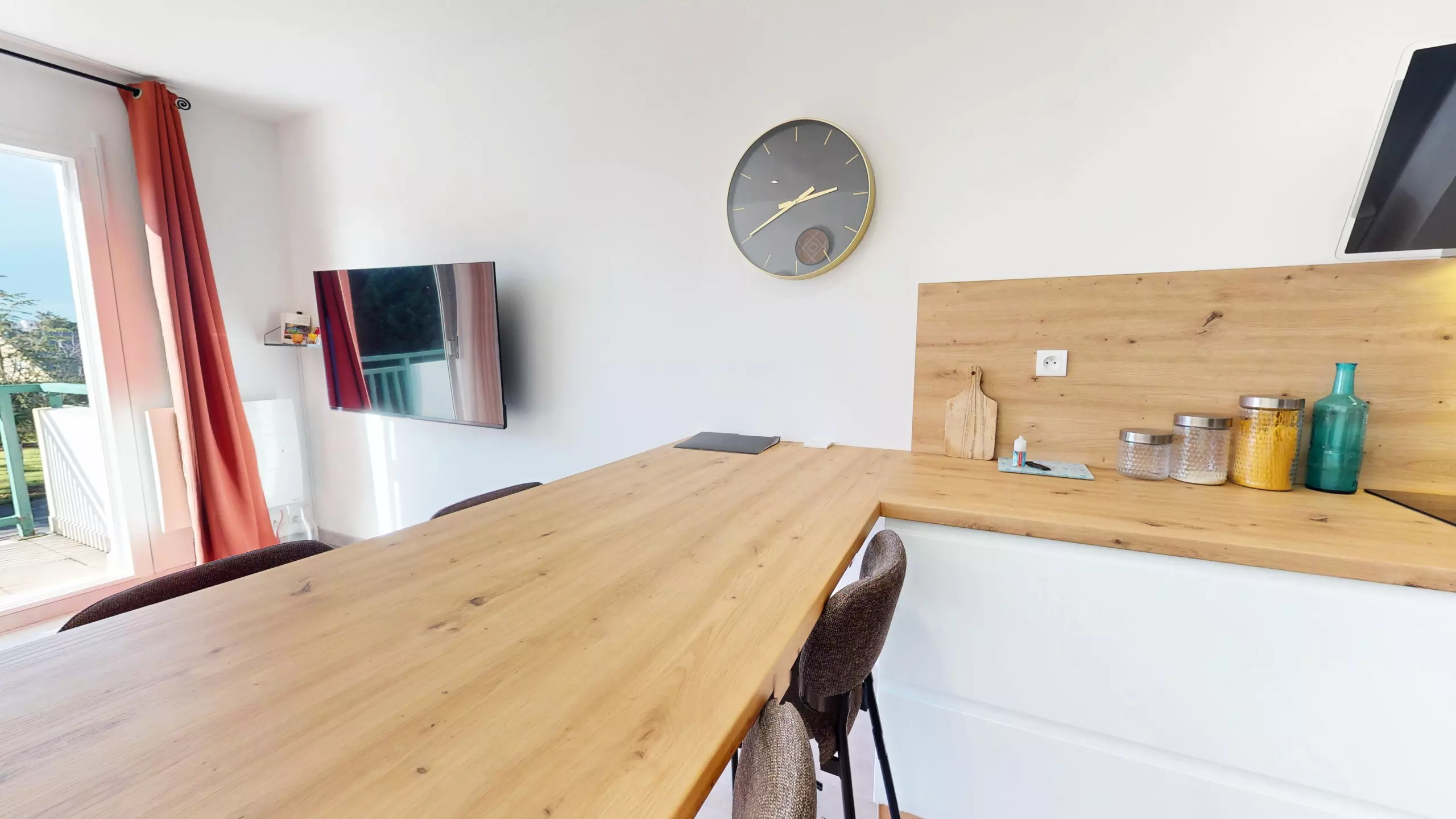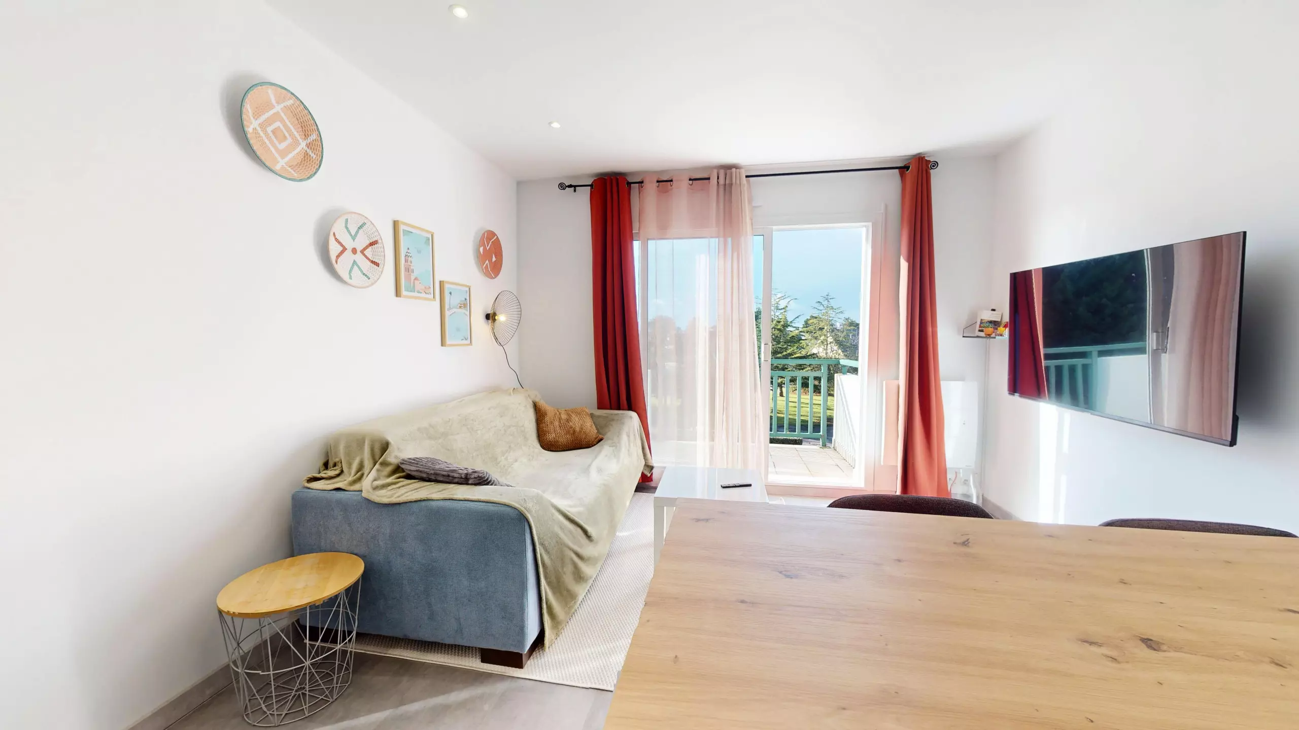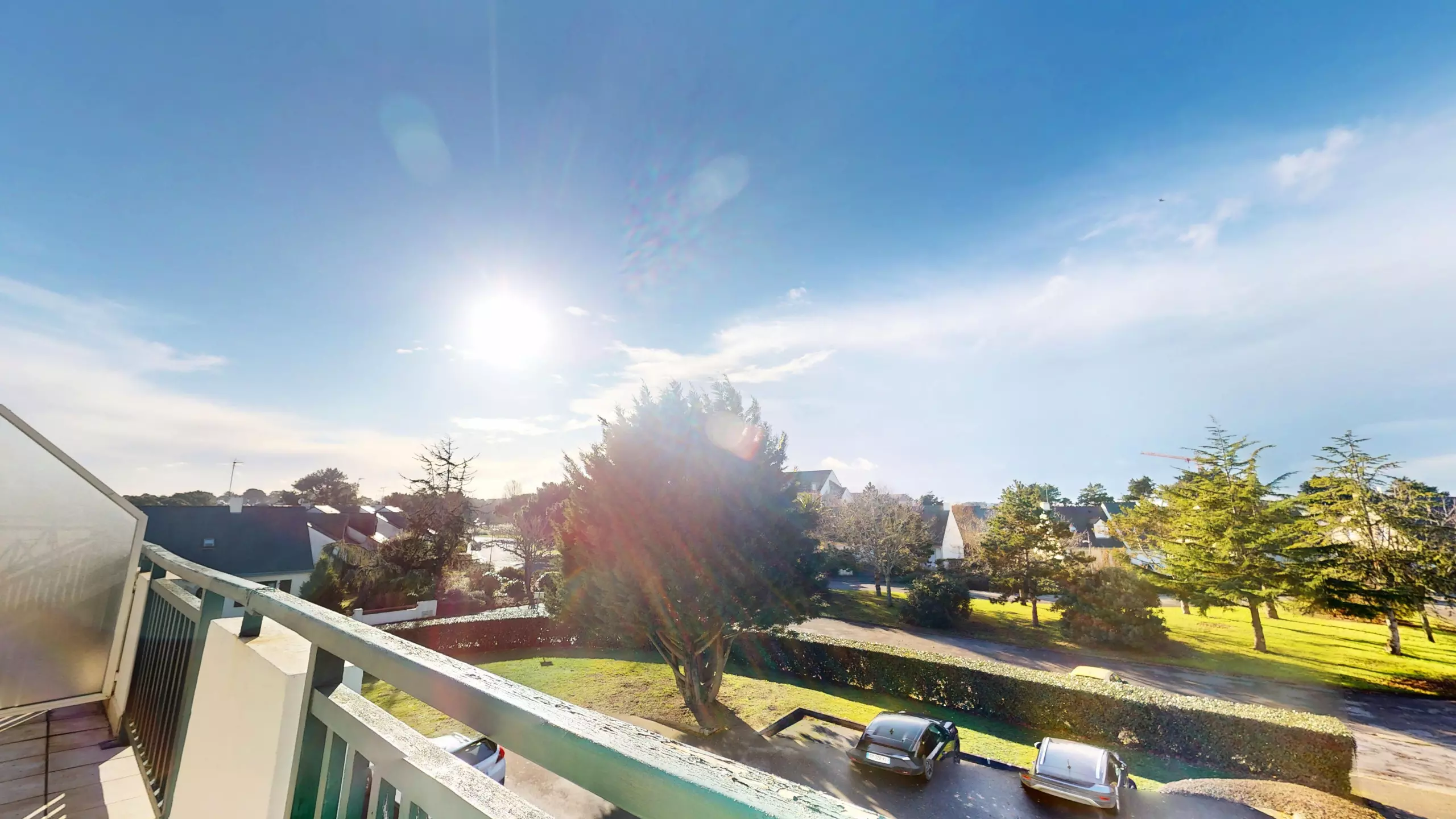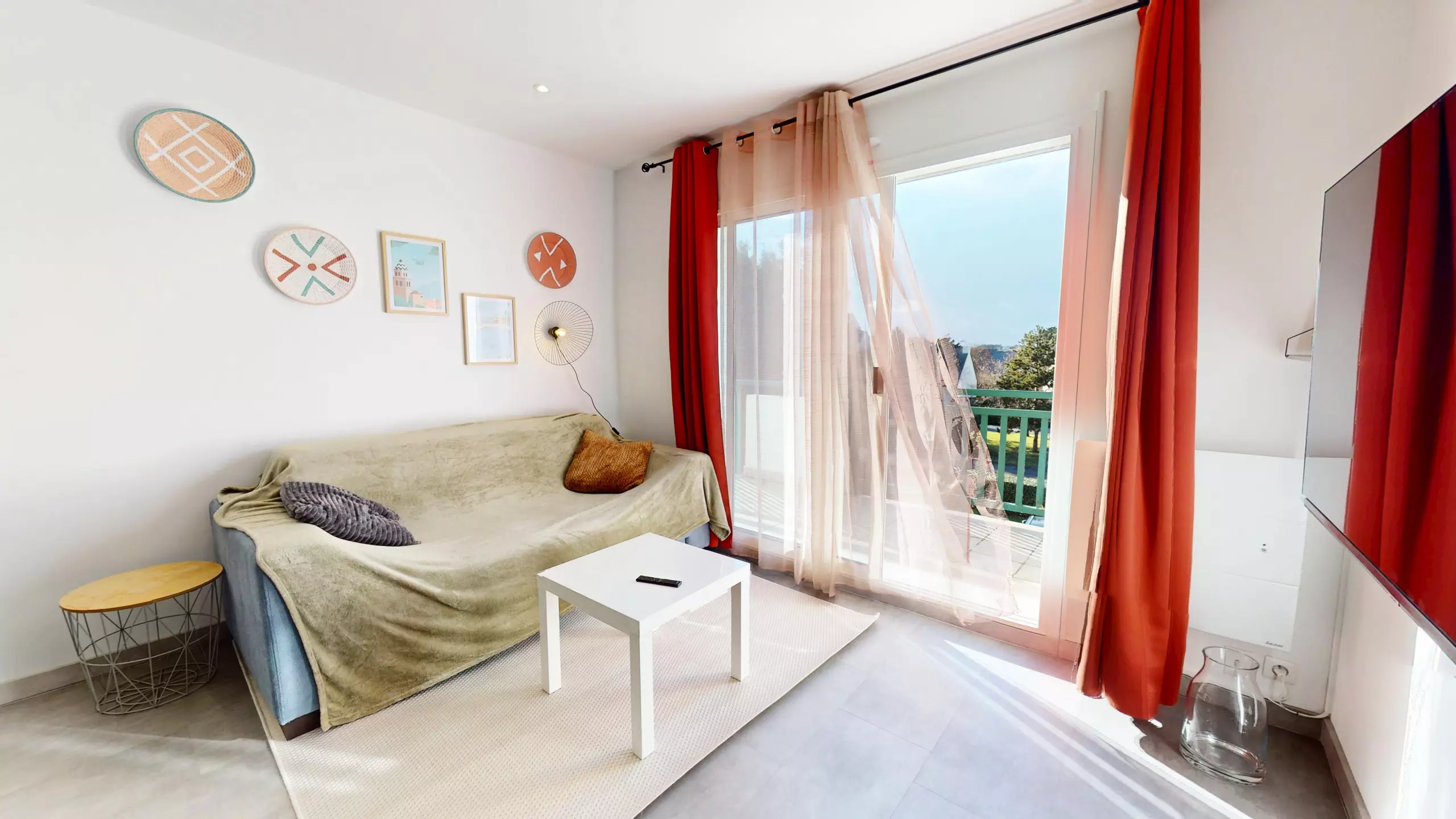 The living room opens onto a large balcony, offering a lovely view of the surrounding houses — a pleasant space to get some fresh air and enjoy the sun in peace and quiet.