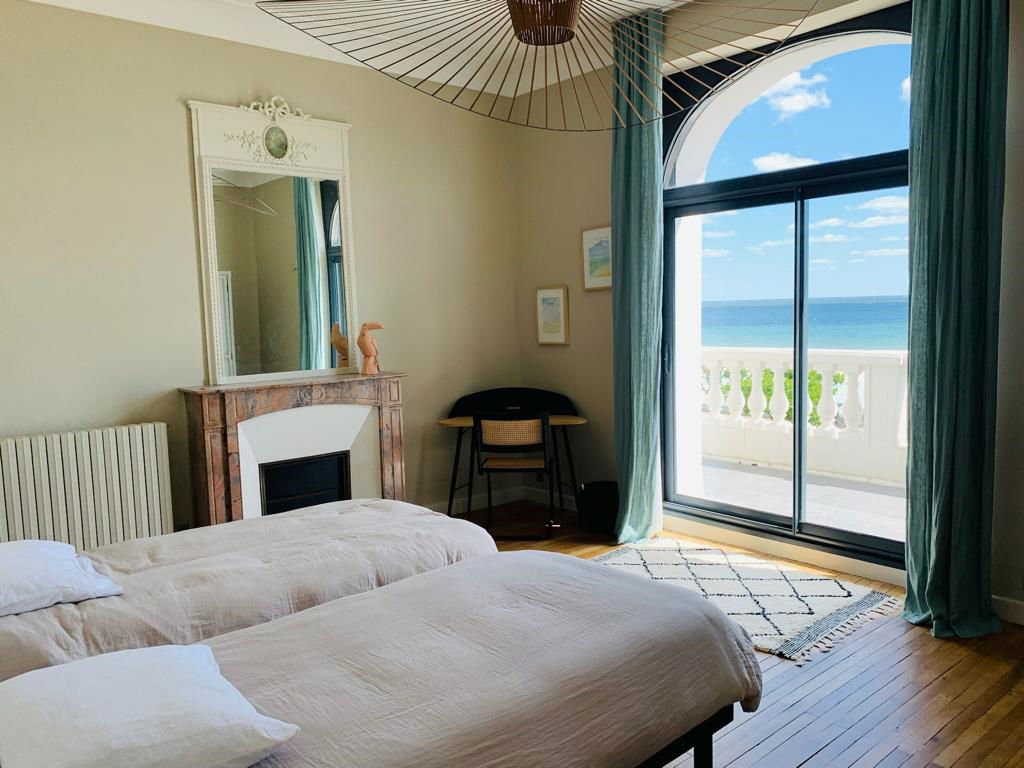Come and stay in this sublime villa with refined decoration facing the sea on the Esplanade Barrière, a stone's throw from the Hôtel Hermitage. Entrance - Beautiful living room / lounge offering a view facing the sea - Tv lounge - Large welcoming kitchen with dining area opening onto a terrace and the garden - Separate WC. Floor n°1: Landing serving Bedroom n°1 with 2 90/190 beds + wardrobe - Bedroom n°2 with 2 90/190 beds opening onto the terrace facing the sea - Shower room with WC - Bedroom n°3/parental suite with 180/200 bed overlooking the terrace facing the sea, dressing room and beautiful bathroom with shower, bath and toilet. Floor n°2: Bedroom n°4 with double bed and shower room - Bedroom n°5 with double bed + extra bed and bathroom. Level R-1: A dormitory for 4 people with 90/190 beds + shower room - Bedroom 7 with a double bed and a shower room. Parking space in front of the villa - Internet.