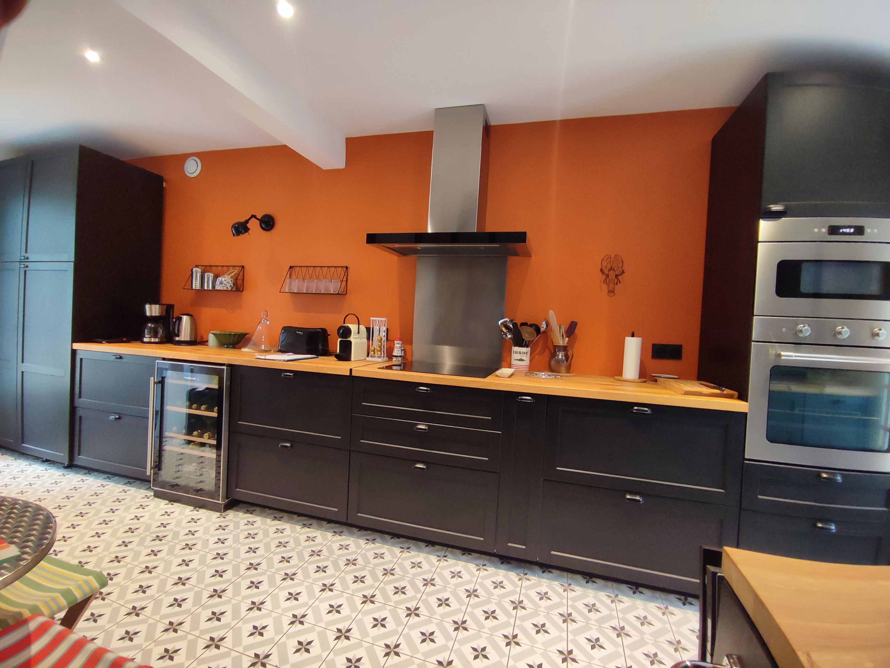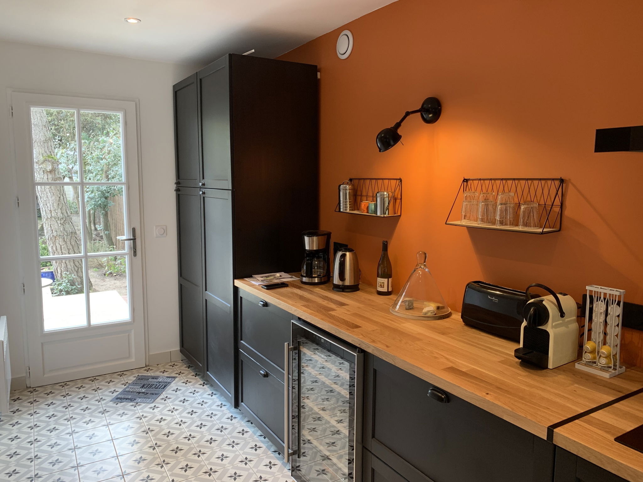 A beautiful fitted and fully equipped kitchen (fridge/freezer, microwave, oven, induction hob, coffee makers, kettle, toaster, dishwasher, iron, vacuum cleaner and wine cellar), semi open to the living room (very pretty glass roof), with access to 2 equipped terraces sheltered from view.