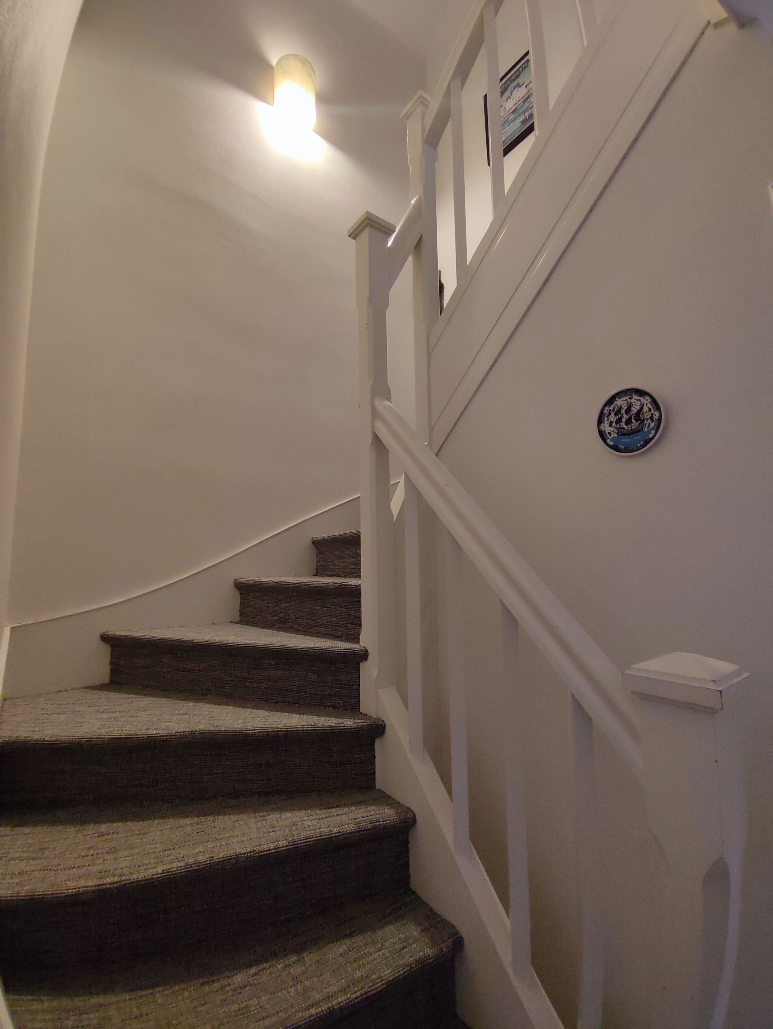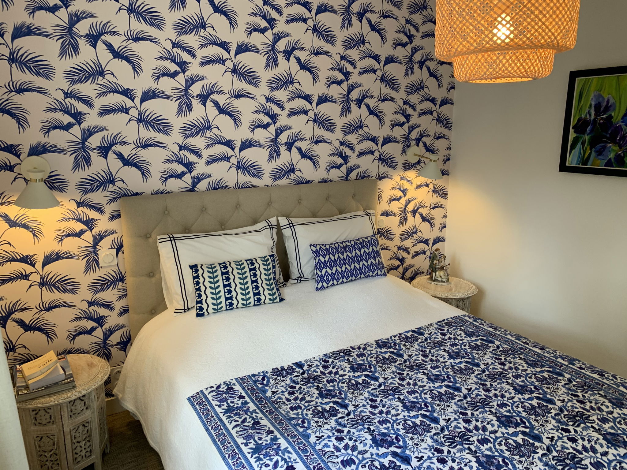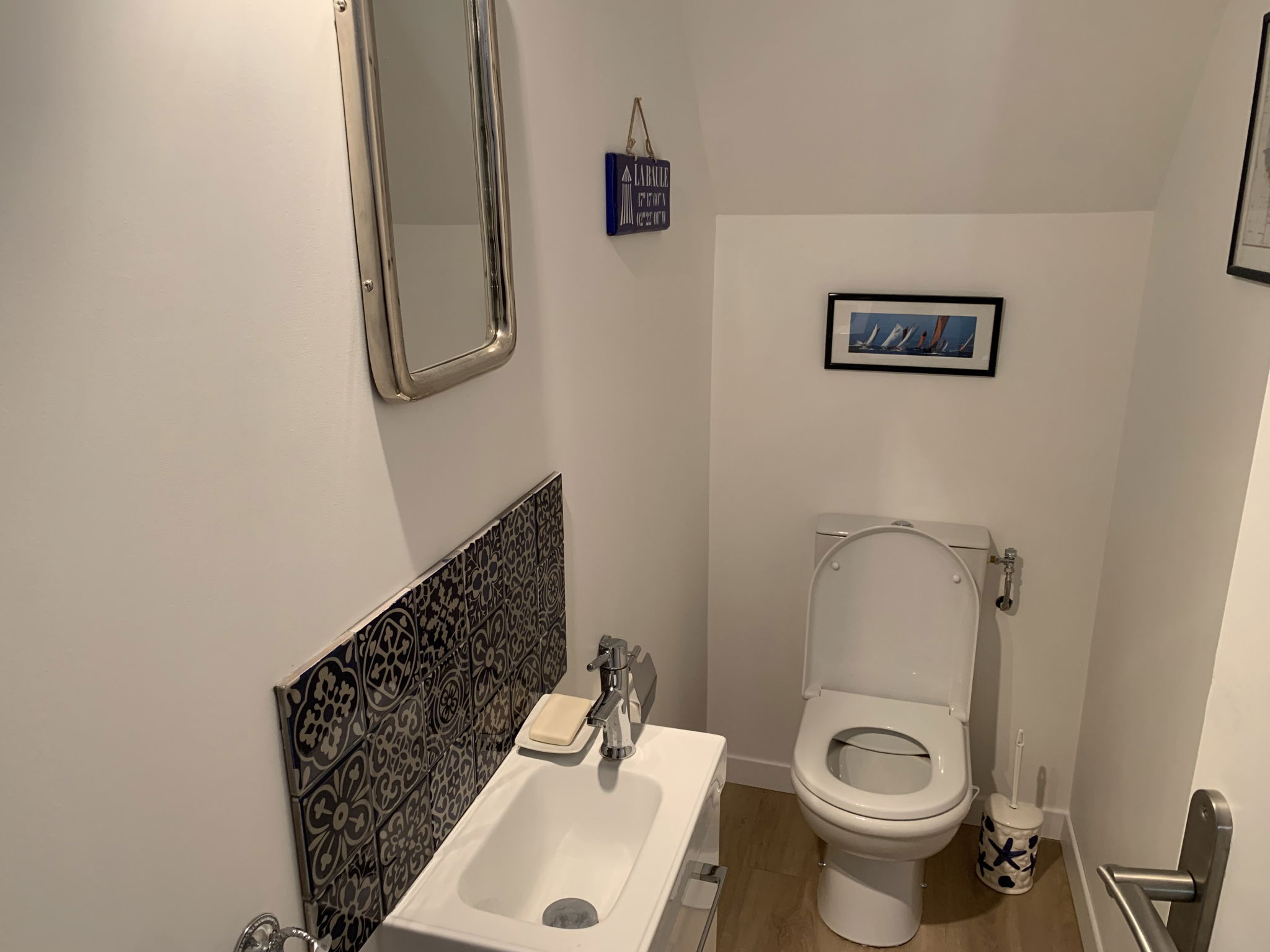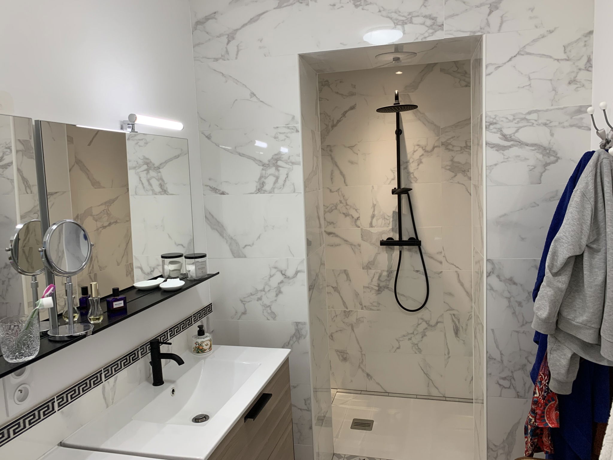 A spacious and modern shower room, 2 sinks with storage unit and fully renovated walk-in shower, 1 separate toilet with washbasin and a large storage cupboard. A 1st bedroom with a 160x190cm bed.