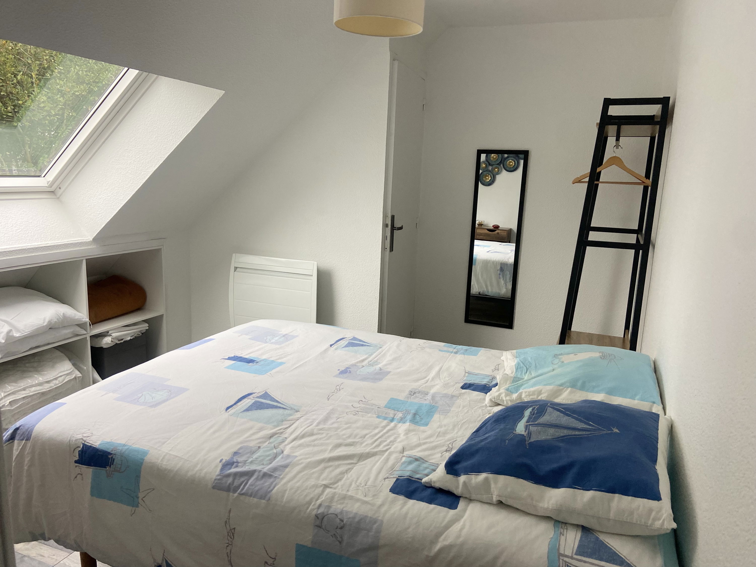 The upstairs bedroom is furnished with a double bed (140x190), a cupboard under the eaves, a wardrobe and a toilet.